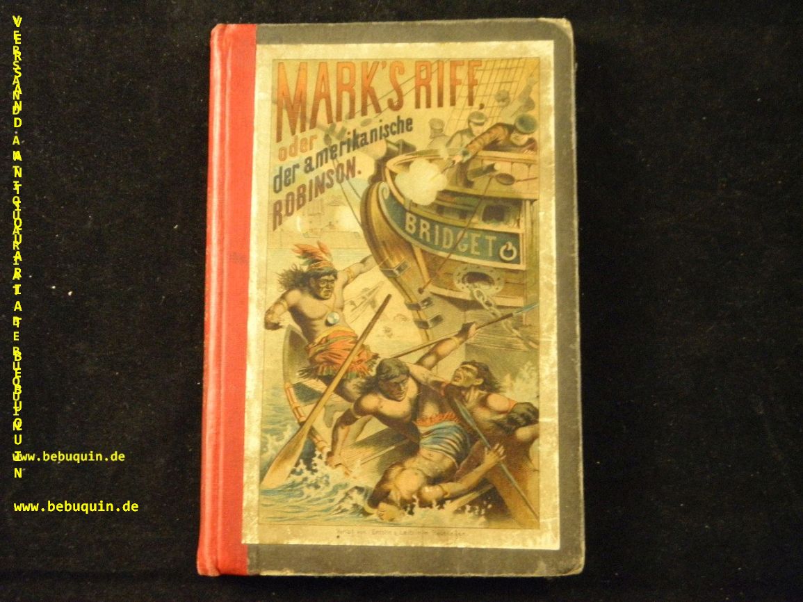 COOPER, James Fenimore: Mark’s Riff oder der amerikanische Robinson. Für die Jugend wiedererzählt von Otto Berger. Stereotyp-Ausgabe. Reutlingen (Enßlin & Laiblin), (1882). kl. 8°. 112 S. mit 6 Bildern in Farbendruck. farb. ill. OHLn. schönes Ex. seltene und reich bebilderter Ausgabe. Klotz 916/180 beschreibt nur 3 Bildtafeln.