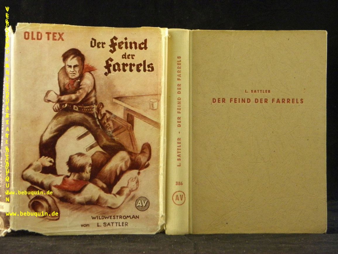 OLD TEX.– SATTLER, Lothar: Der Feind der Farrels. Roman aus Texas. Berlin (Auffenberg), 1949. 254 S. OHLn mit OUmschl. Umschlag an den Rändern lädiert, NaV. seltene EA.