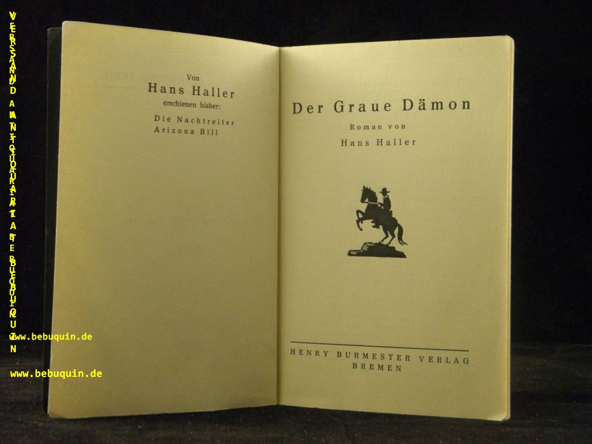HALLER, Hans: Der graue Dämon. Bremen (Burmester), (1933). 256 S. schlichter OKart. gutes Ex. mit Interimseinband. = Burmester’s Abenteuer – Serie. EA. Schegk / Wimmer S1.