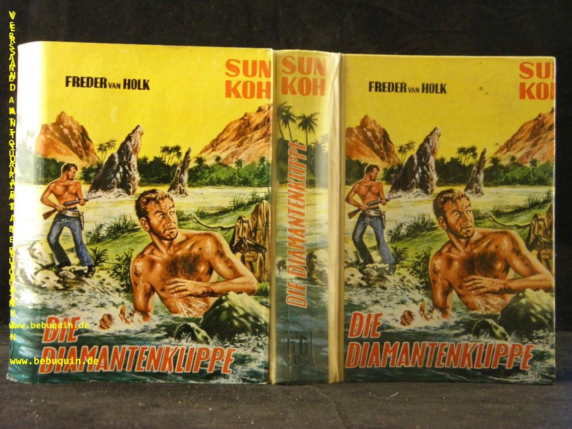SUN KOH.– HOLK, Freder van: Die Diamantenklippe. Abenteuer-Roman. Münster (Borgsmüller), ca 1958. 270 (2) S. farb. ill. OHLn mit OUmschl. gestempeltes Leihbuch, gutes Ex. EA.