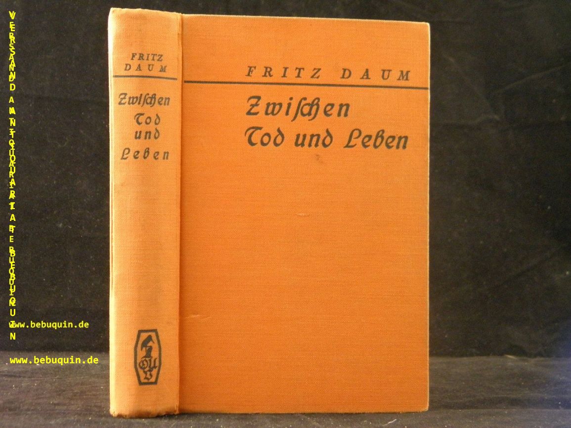 DAUM, Fritz: Zwischen Tod und Leben. Abenteuerroman. Berlin (Uhlmann), 1935. 292 (4) S. OLn. NaV, hinteres Gelenk etwas gelockert, noch gutes Ex. = Uhlmann – Bücher. EA.