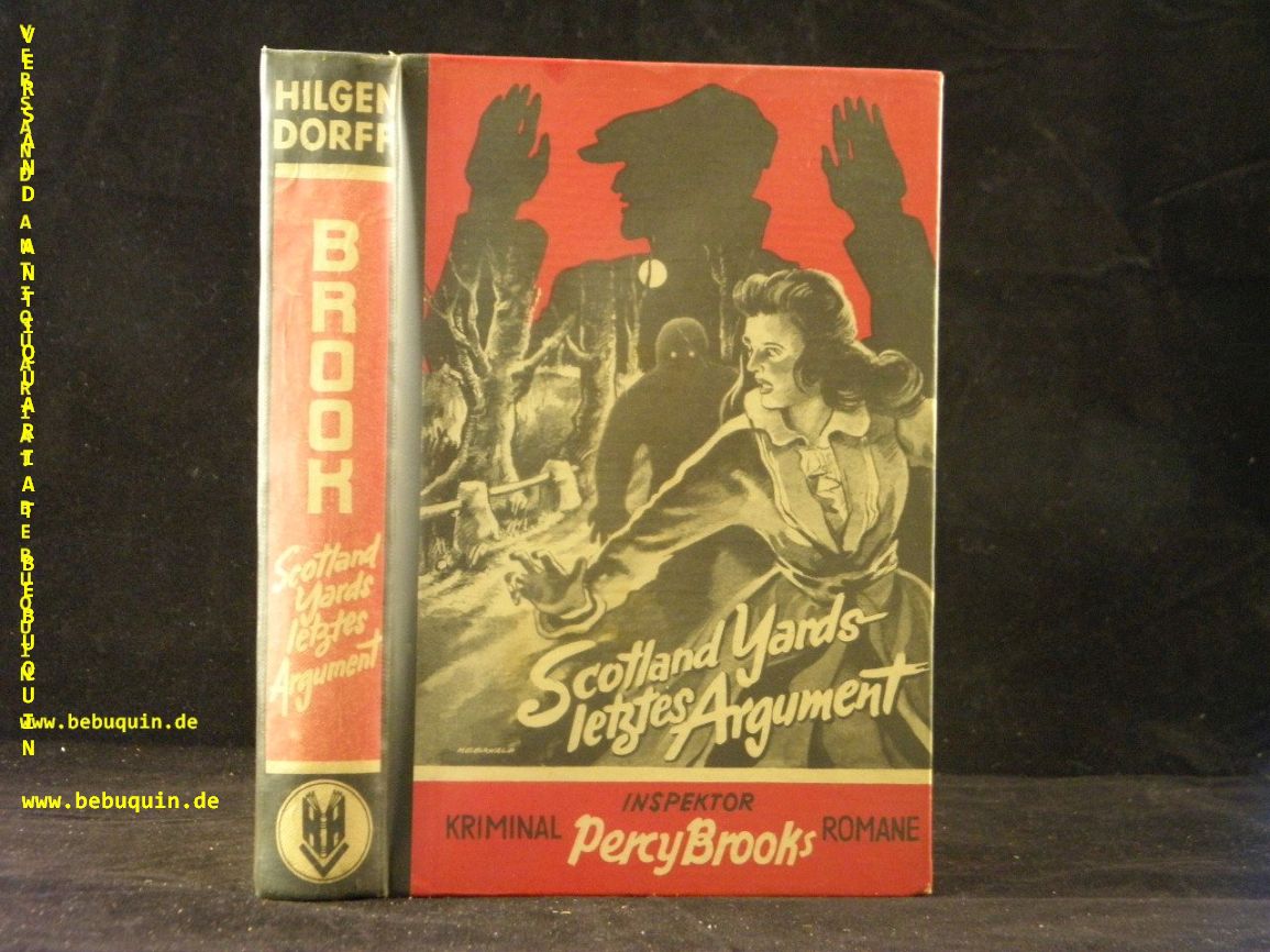 INSPEKTOR PERCY BROOK.– HILGENDORFF, Hermann: (d.i. Kurt Müller) Scotland Yards letztes Argument. Kriminalroman. Bayreuth (Hilgendorff), 1950. 288 S. farb. ill. OPb. gutes Ex. = Reihe der Kriminalromane, Bd. II. EA.