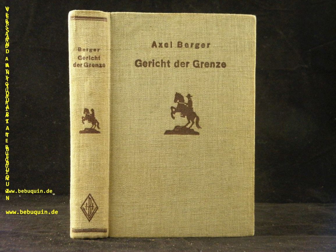 BERGER, Axel: (d.i. Albert Karl Burmester) Gericht der Grenze. Bremen (Burmester), (1937). 224 S. ill. OLn. kaum gebräunt, gutes Ex. = Burmester’s Abenteuer-Serie. EA. Schegk / Wimmer S22.