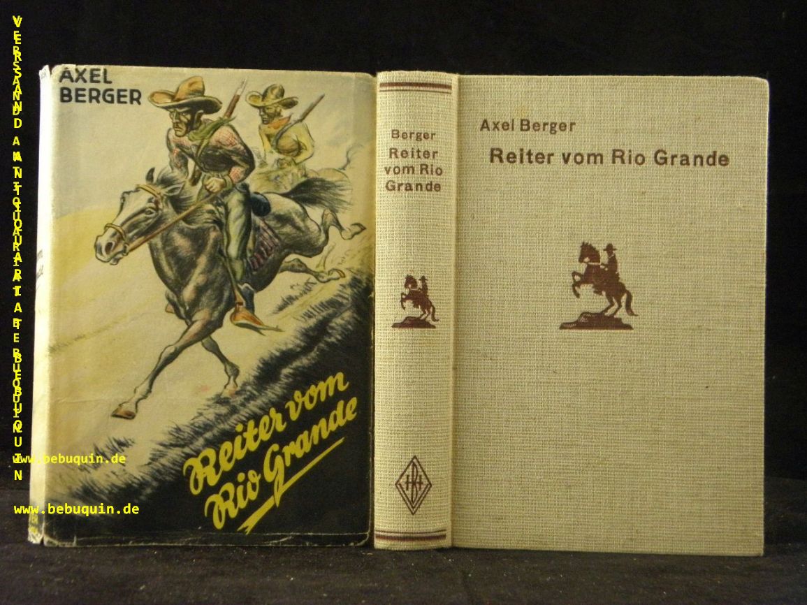 BERGER, Axel: (d.i. Albert Karl Burmester) Reiter vom Rio Grande. Bremen (Burmester), (1936). 253 (3) S. ill. OLn. mit OUmschl. eine Umschlagklappe fehlt, StaT. = Burmester’s Abenteuer-Serie. seltene 1. und einzige Ausgabe. Schegk / Wimmer S57.