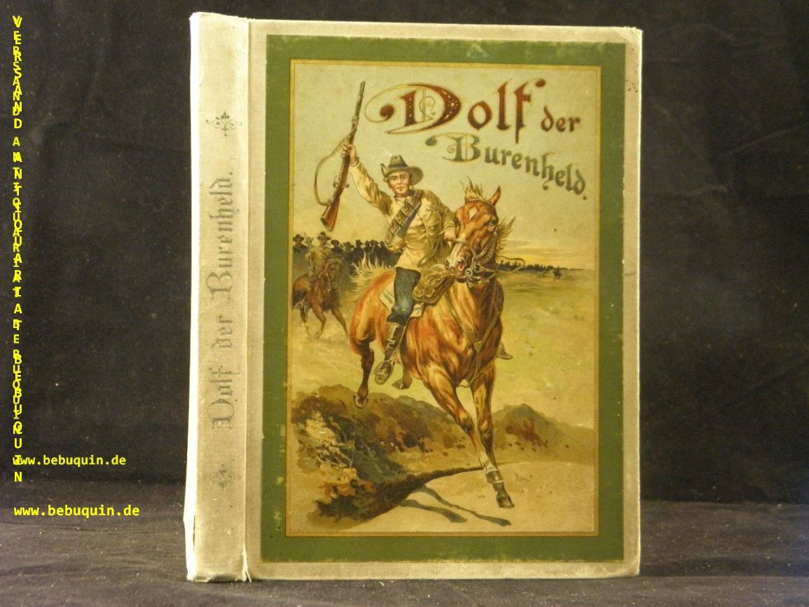 KOLONIEN.– WILDENSTEIN, Kurt: (d.i. Anton Oskar Eugen Klaußmann) Dolf der Burenheld. Gefahren und Erlebnisse eines jungen Deutschen im jüngsten Burenkriege. 5. Aufl. Stuttgart (Effenberger), 1902. 156 S. mit 4 Farbendruck- sowie 8 Tonbildern. farb. ill. OLn. Kanten etwas berieben, NaV. Klotz 3433/5.