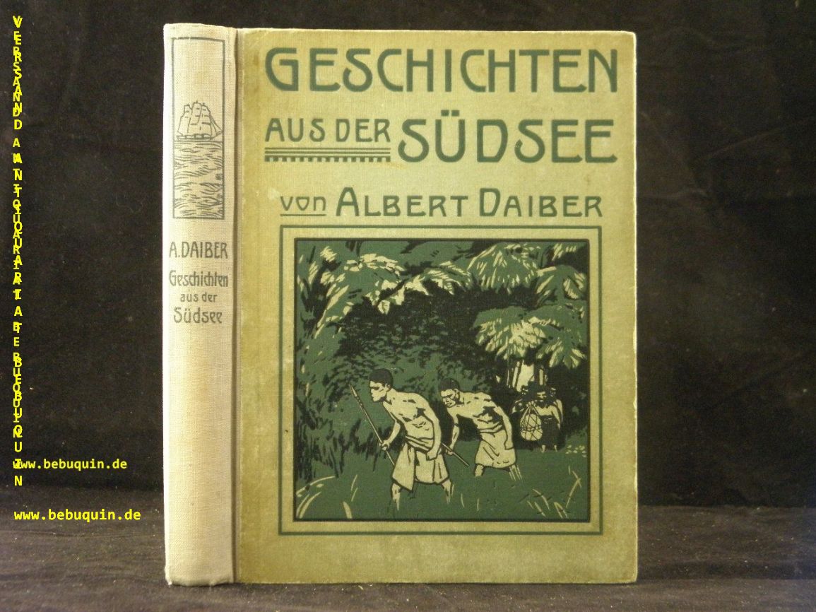 DAIBER, Albert: Geschichten aus der Südsee. Zwei geschichltliche Erzählungen. Stutttgart (Weise), (1908). 188 S. mit 4 farb. und 7 Tondruckbildern von Willy Planck. farb. ill. OHLn. Einband leicht gebräunt, sonst gut erhalten. EA. Klotz 969/4.