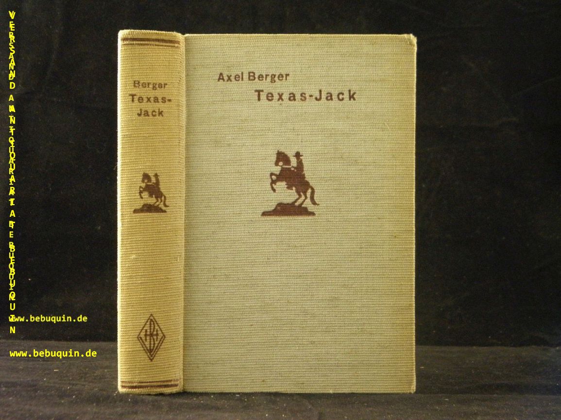 BERGER, Axel: (d.i. Albert Karl Burmester) Texas-Jack. Bremen (Burmester), (1938). 256 S. ill. OLn. kaum gebräunt, gutes Ex. = Burmester’s Abenteuer-Serie. EA und einzige Ausgabe. Schegk / Wimmer S78.