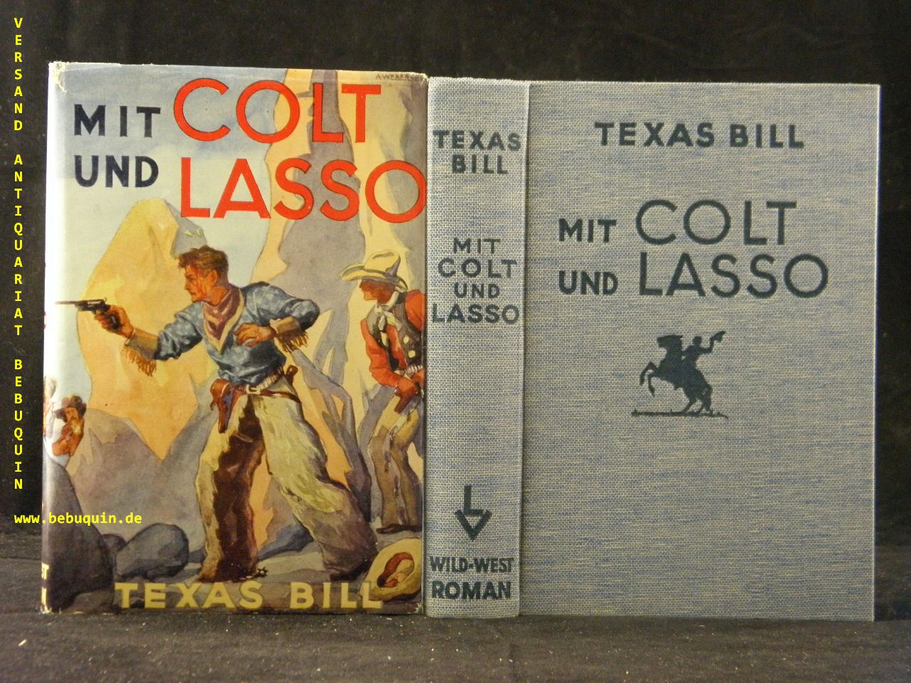 TEXAS BILL.– SCHUBERT, P.H.: Mit Colt und Lasso. Wild-West-Roman. Leipzig (Lipsia), 1939. 280 S. ill. OLn. mit OUmschl. Umschlag mit minimalen Randläsuren, sehr schönes Ex. seltene EA.