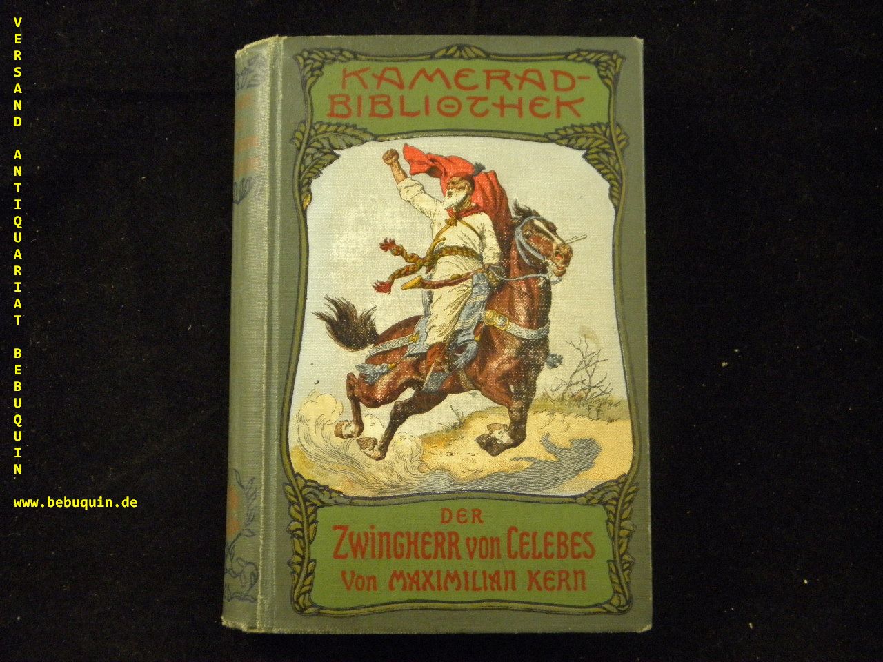 KAMERAD-BIBLIOTHEK.– KERN, Maximilian: Der Zwingherr von Celebes. 2. Aufl. Stuttgart (Union), 1914. kl. 8°. 324 S. mit zahlr. Bildern + Werbeanhang. farb. ill. OLn. leicht schief gelesen, NaT. = Bd. 21. Klotz 3341/10.