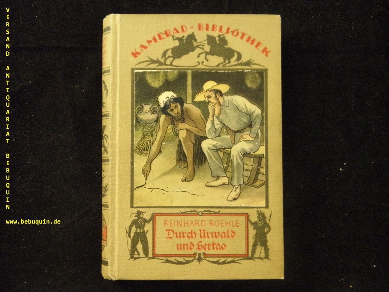 KAMERAD-BIBLIOTHEK.– RÖHLE, Reinhard: Durch Urwald und Sertao. 20. Aufl. Stuttgart (Union), 1922. kl. 8°. 300 S. mit Titelbild mit zahlr. Textbildern + Werbeanhang. farb. ill. OLn mit mont. Farbbid. NaT, feines Ex. = Bd. 25. Klotz 5934/18.