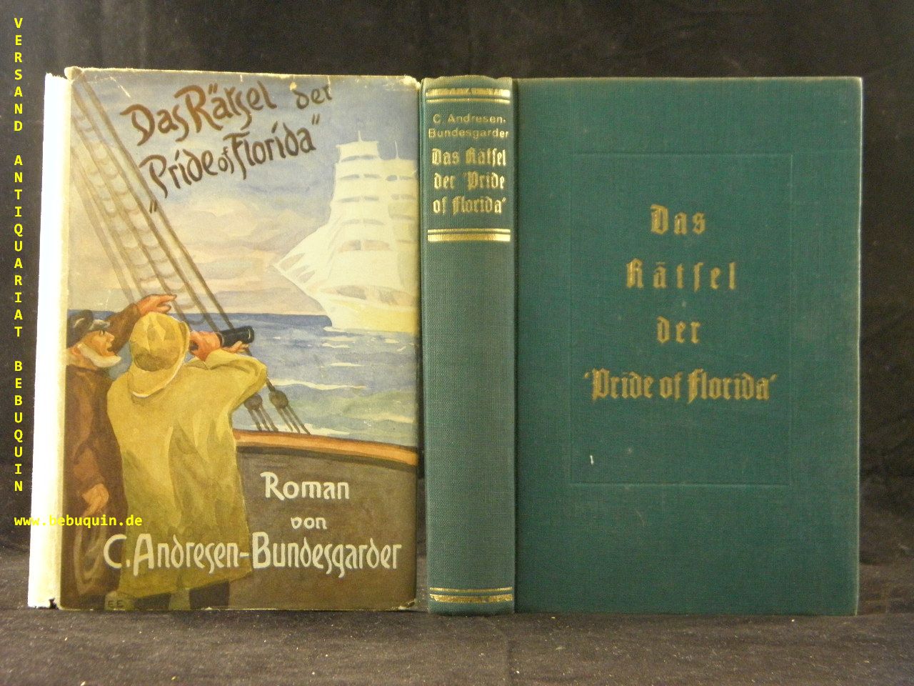 ANDRESEN-BUNDESGARDER, Christian: Das Rätsel der „Pride of Florida“. Hamburg (Sauerberg), 1936. 276 (2) S. OLn. mit OUmschl. Umschlag am Rand leicht gebräunt und lädiert. seltene EA. Der Kapitän, Maler und Schriftsteller Christian Andresen wurde am 24. Feburar 1878 in Aventoft, Kreis Südtondern, geboren und lebte seit Ende des Ersten Weltkrieges bis zu seinem Tod am 5. November 1960 vorwiegend in Hamburg-Groß Flottbek. Sein Namenszusatz „Bundesgarder“, den er seit den dreißiger Jahren führte, hängt vermutlich mit seiner Abstammung von einem alteingesessenen Bauerngeschlecht auf Bundesgaard im Gotteskoog in Nordfriesland zusammen. Im Laufe der fünfziger Jahre änderte er Andresen-Bundesgarder in Andresen-Bundisgard.