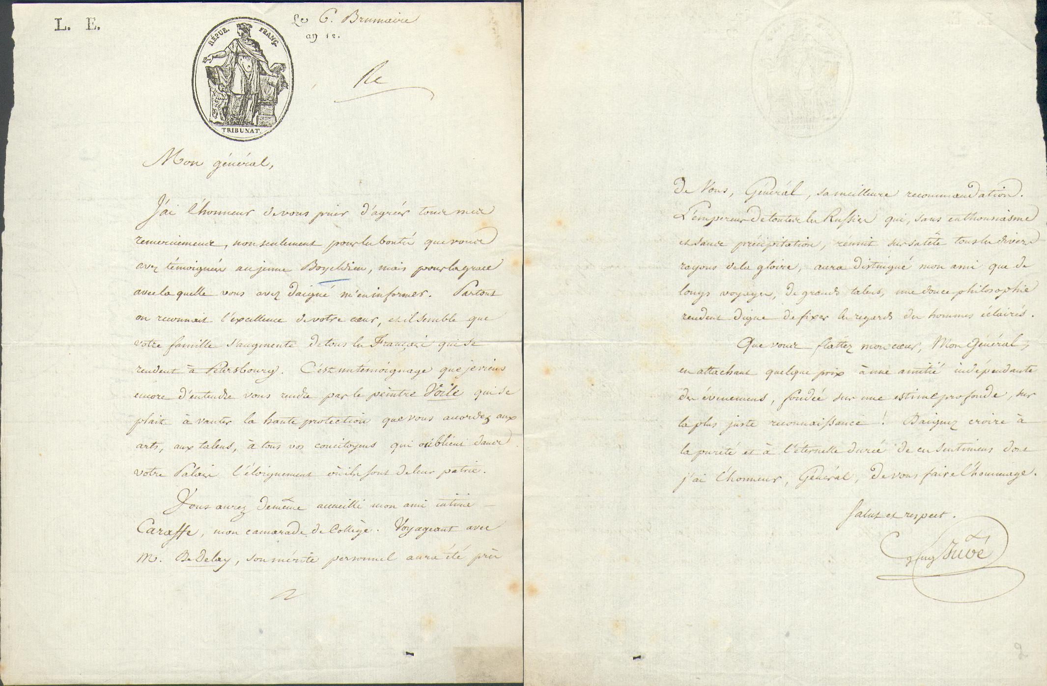 JUBÉ, Auguste (Verlepetit 1765 – Dourdan 1824). Baron de la Perelle: Eigenhändiger Brief mit Unterschrift an einen General in Sankt Petersburg. Verfasser war Mitglied des Tribunats und dankt für die Großzügigkeit gegenüber den Franzosen in St. Petersburg. Besonderen Dank spricht er ihm aus für die Unterstützung einiger französischer Künstler u.a. Armand-Charles Caraffe (1762-1822), Schüler von David und Freund von Jubé. (Paris), 29.10.1803. 23 x 17 cm. Hadernbütten mit Wasserzeichen und gestochener Vignette des Tribunats. gut erhalten. Maréchal de Camp (1814). Inspekteur der Küsten des Departements Manche 1793, wäre beinahe hingerichtet worden, weil er eine Büste von Marat zerbrochen hatte; Adjudant-Général 1796, diente als Stabschef unter dem Kommando von Hoche, im selben Jahr noch Kommandant der Garde des Direktoriums, erhielt beim Staatsstreich Bonapartes, den er unterstützte, aus dessen Händen einen Ehrensäbel und wurde zum Stabschef für die Organisation der konsularischen Garde ernannt; daraufhin Mitglied des Tribunats, bis es 1808 aufgelöst wurde; danach Präfekt des Departements Doire 1808-1813, dann des Departements Gers 1813-1814, dann Chef des Kabinetts des Kriegsministers Dupont de l’Etang nach der Ersten Restauration.