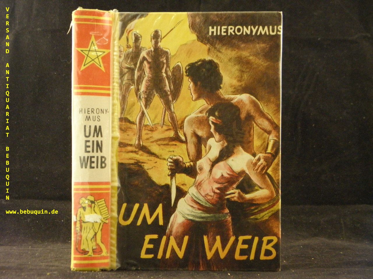 HIERONYMUS: Um ein Weib. Roman. Kaiserslautern (Schäfer), 1954. 292 S. farb. ill. OHLn. StaV, Vorsatz mit kleiner Eckbeschädigung. EA.