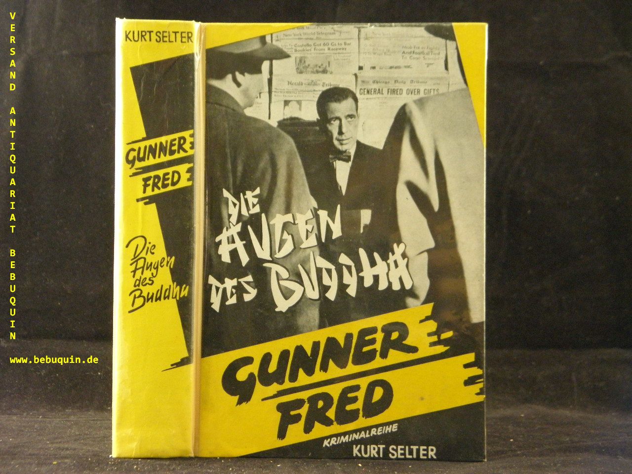 GUNNER FRED.– SELTER, Kurt: Die Augen des Buddha. Kriminalroman. Bayreuth (Helios), 1953. 256 S. farb. ill. OHln. gestempeltes Leihbuch. EA.