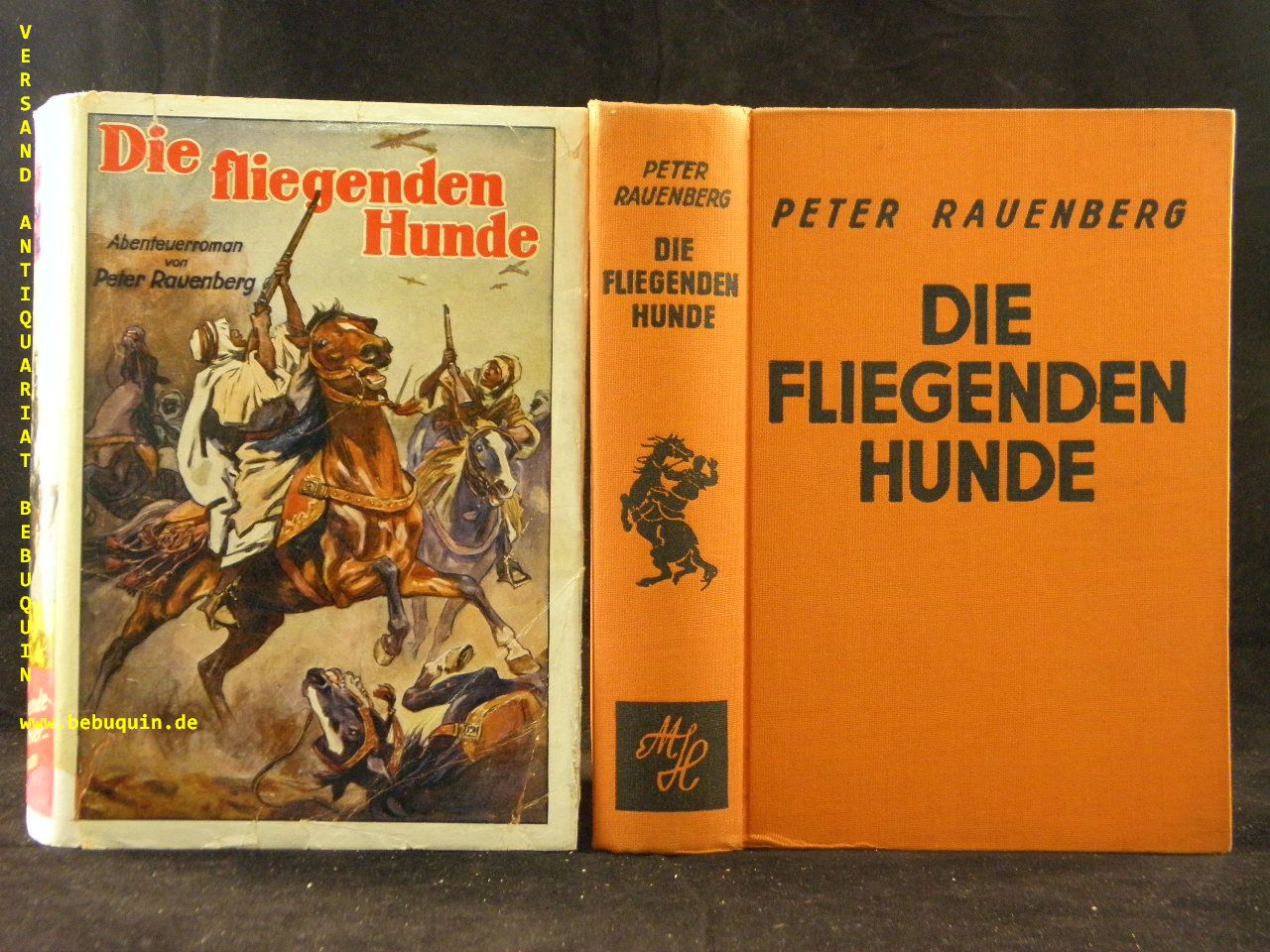 RAUENBERG, Peter: Die fliegenden Hunde. Abenteuerroman aus dem Irak. Berlin (Moewig & Höffner), 1935. 309 (10) S. OLn. mit OUmschl. Umschlag fast komplett hinterlegt. sehr seltene EA.