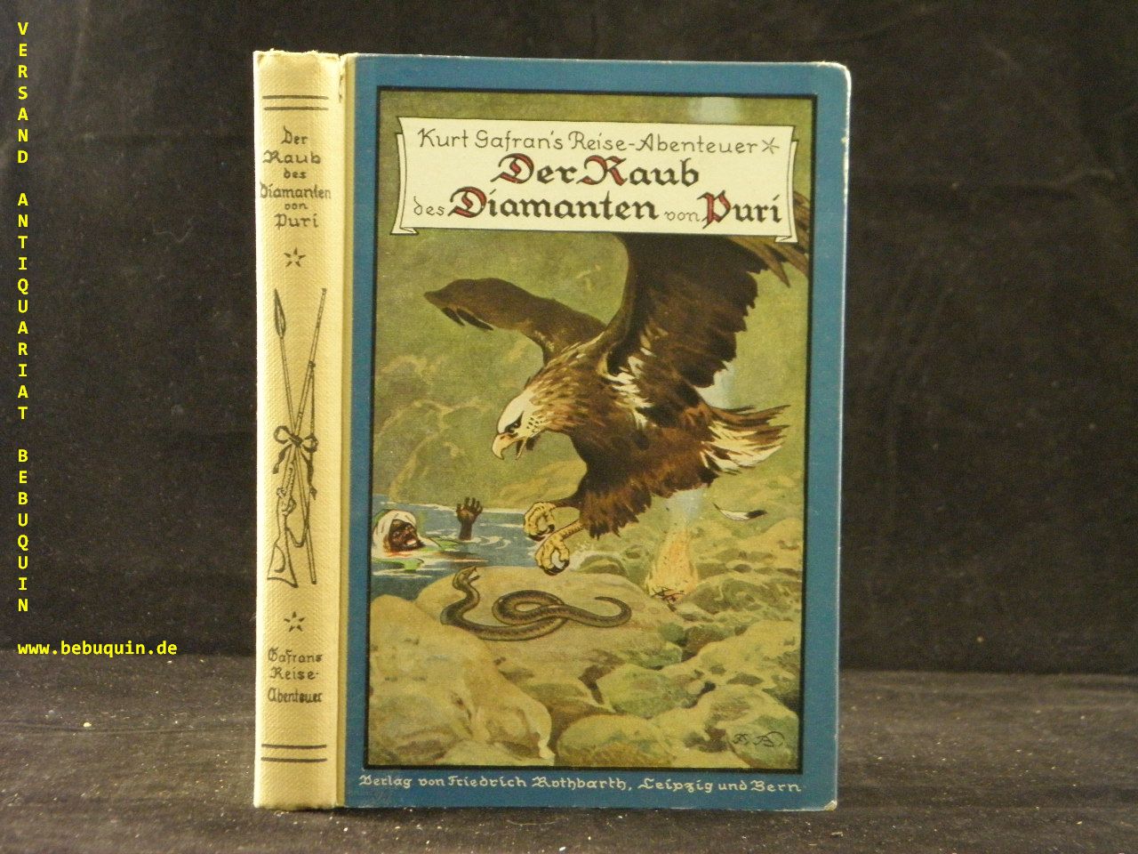 GAFRAN, Kurt: (d.i. Kurt von Gagern) Der Raub des Diamanten von Puri. Reise-Abenteuer unter indischer Sonne. Leipzig und Bern (Friedrich Rothbarth), (1923). 186 (6) S. farb. ill. OHLn. von Fritz Bamgarten mit OUmschl. Umschlag mit leichten Randläsuren, sonst gutes Ex. = Reise-Abenteuer, 3. Bd. EA Klotz 1771/5.