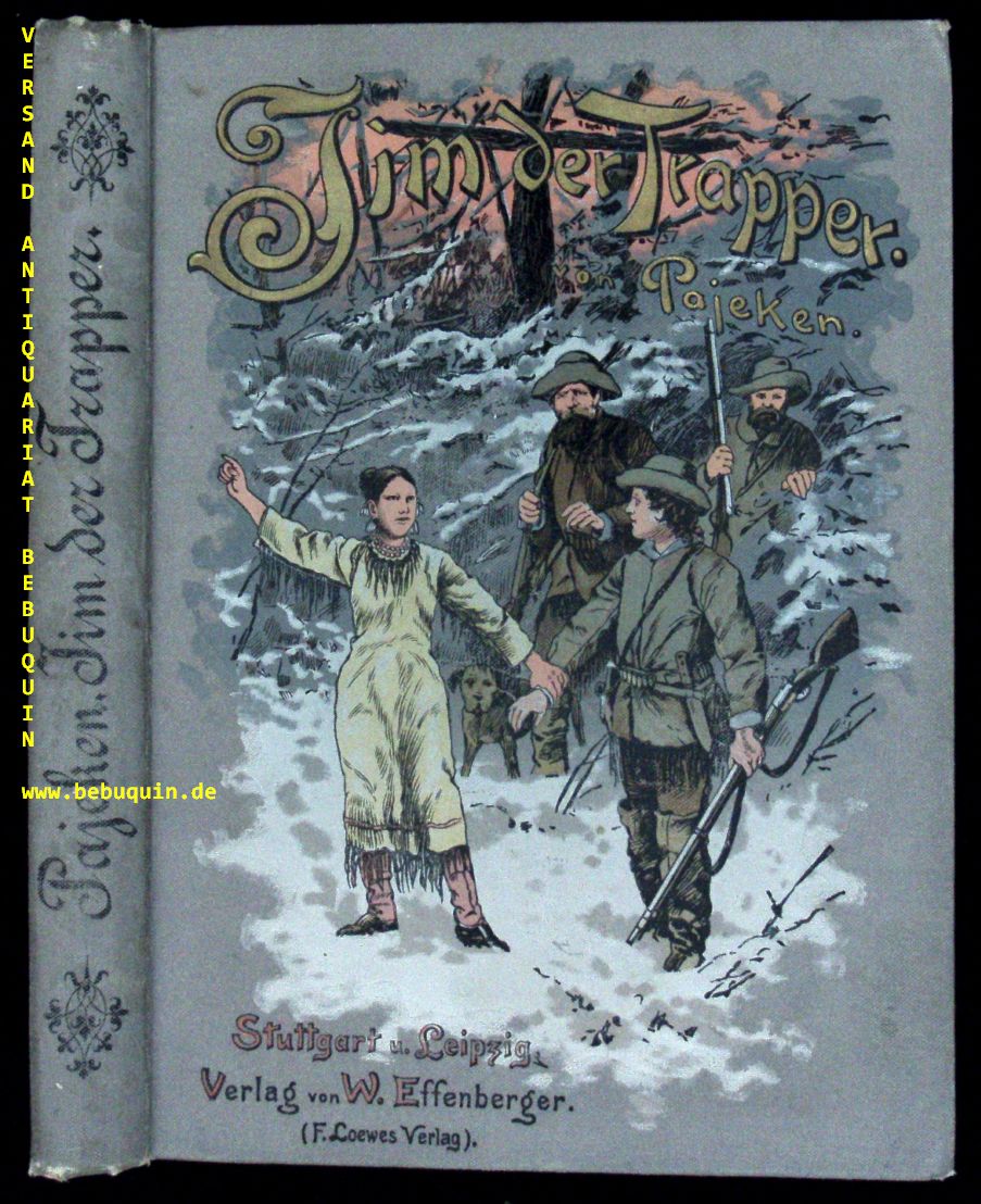 PAJEKEN, Friedrich J.: Jim der Trapper. Eine Erzählung aus dem Wilden Westen Nordamerikas. Stuttgart (Loewe), (1892). V, 160 (2) S. mit 4 Farbendruckbildern von Fritz Bergen. farb. ill. OLn. kaum gelockert, schönes Ex. EA. Klotz 5284/13. Friedrich Joachim Pajeken (Bremen 1855 – 1920) war Kaufmann und Verfasser von Abenteuerromanen für Jugendliche. „1876 wurde er als Kaufmann nach Ciudad Bolívar am Orinoko geschickt, wo er in den nächsten drei Jahren Erfahrungen im Überseehandel sammelte. Seinen dortigen Aufenthalt nutzte er für zahlreiche Streifzüge durch das Land. Nebenbei befasste er sich eingehend mit den in Bolivien lebenden Indianern. Um auch die nordamerikanischen Indianer kennenzulernen, begab er sich für zwei Jahre auf die ‚Hollers Ranch‘ am Brod River in den Bighorn Mountains und knüpfte gute Kontakte zu den dort lebenden Indianern. Von diesen erhielt er aufgrund seiner etwas gelblichen Hautfarbe und seiner Leistungen als guter Jäger den Ehrennamen ’Yellow Eagle.“ (wikipedia).–