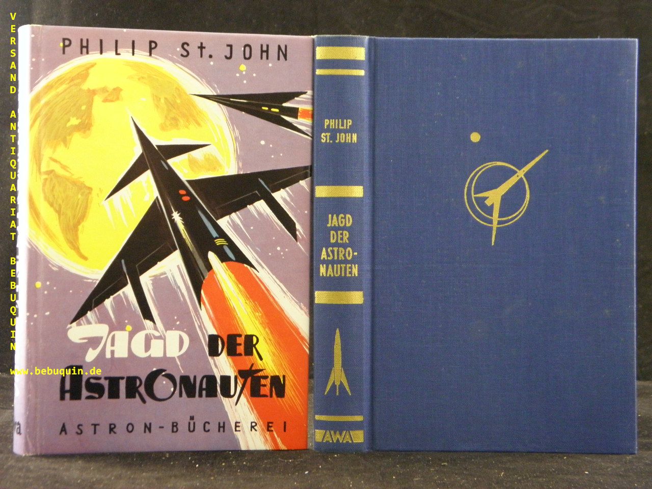 ST. JOHN, Philip: Jagd der Astronauten. Zukunftsroman. München (Awa), ca 1957. 192 S. ill. OLn mit OUmschl. gestempeltes Leihbuch, Innendeckel mnit Tesaresten. = Astron-Bücherei. EA.
