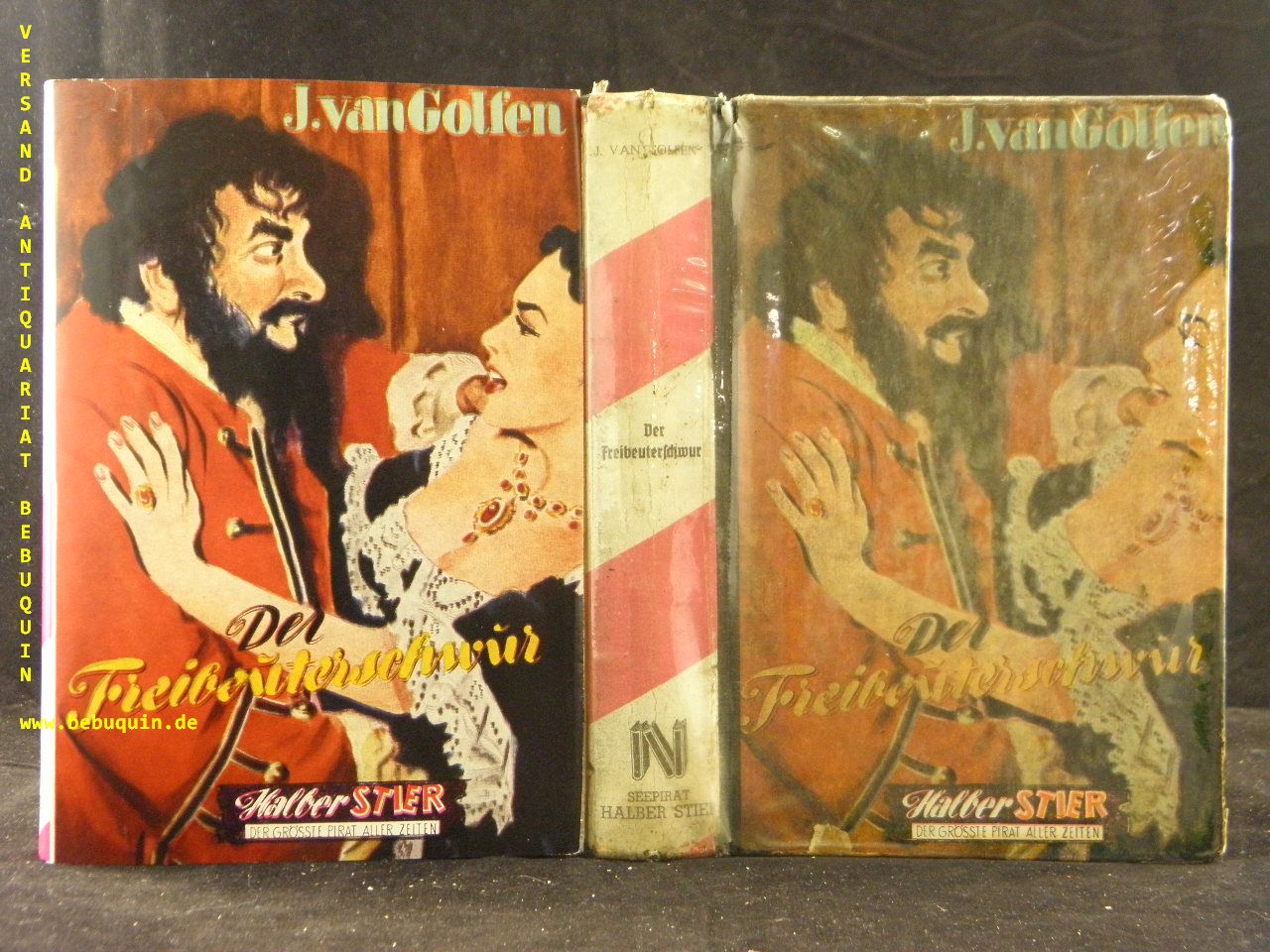 GOLFEN, Jan van: Der Freibeuterschwur. Frankfurt (Reihenbuch), 1953. 256 S. farb. ill. OHLn mit OUmschl. Einband etwas berieben, fliegender Vorsatz fehlt, mehrfach gestempeltes Leihbuch. = Halber Stier, der grösste Pirat aller Zeiten, Bd. 10. EA.