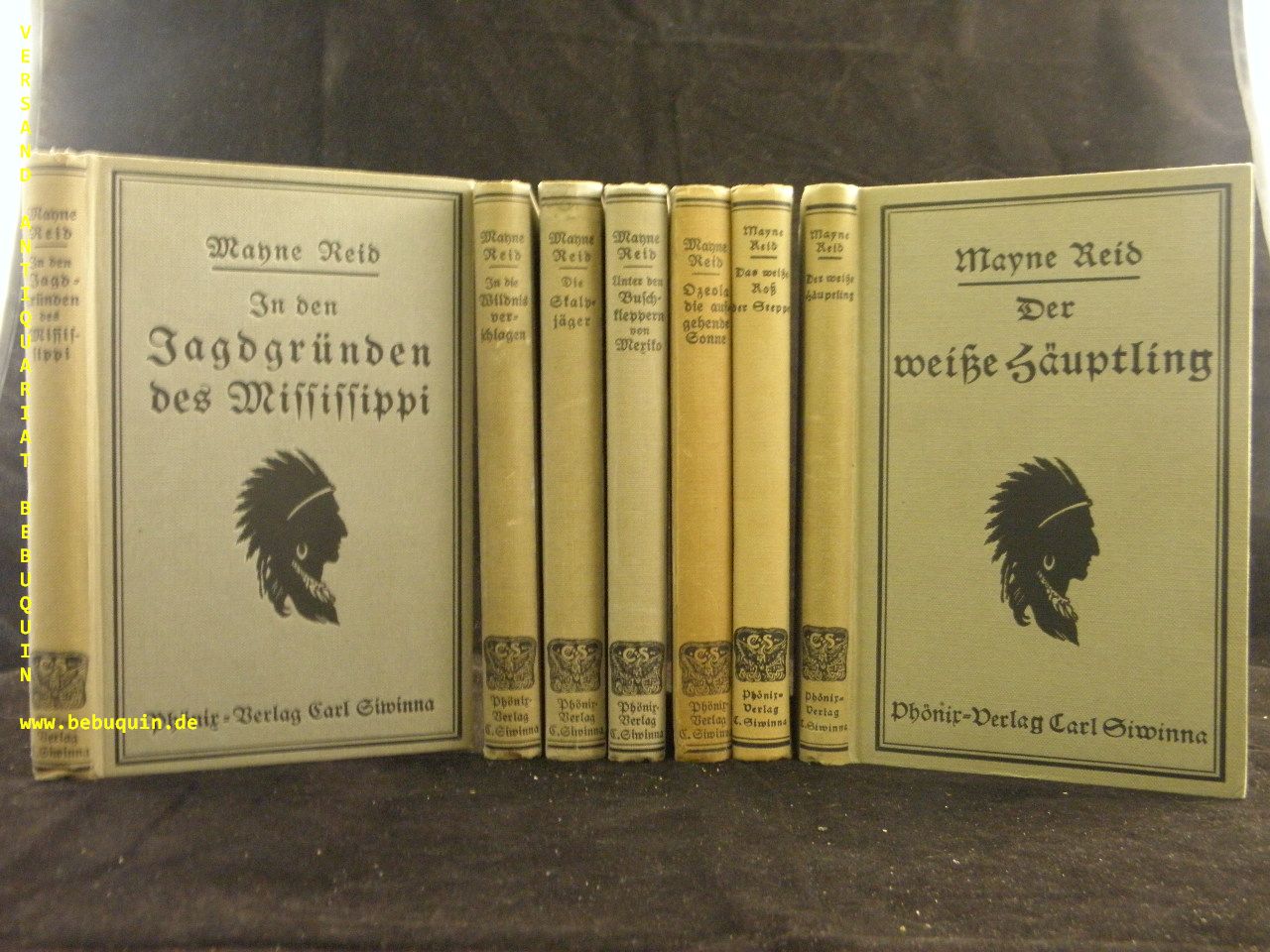 REID, Thomas Mayne: Ausgewählte Werke. Hrsg. und bearb. von Walter Heichen. 1. In den Jagdgründen des Mississippi. 2. In die Wildnis verschlagen. 3. Die Skalpjäger. 4. Unter den Buschkleppern von Mexiko. 5. Oseola, die aufgehende Sonne der Seminolen. 6. Das weiße Roß der Steppe. 7. Der weiße Häuptling. 7 Bände (so komplett). Berlin (Phönix), (1920/21). 158, 160, 153 (7), 160, 160, 156 (4), 160 S. mit 7 Frontispizen von A. Roloff. ill. OPb mit kopierten Farbumschlägen. ein Vortitel mit Namenseintrag, vereinzelt etwas gelockert, sonst annähernd neuwertig. Sehr seltene 1. und einzige deutsche Werkausgabe. EA. Schegk / Wimmer 10.3 auf S9.
