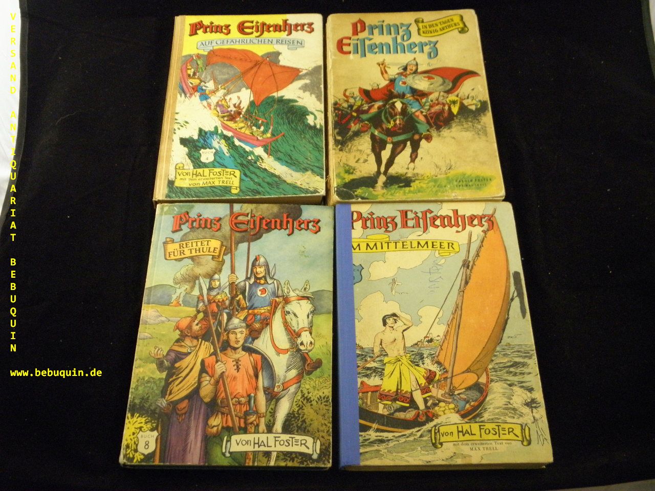 FOSTER, Harold + TRELL; Max: Prinz Eisenherz – Konvolut mit 4 Bänden. Im Einzelnen: Im Mittelmeer. Reitet für Thule. In den Tagen König Arthurs. Auf gefährlichen Reisen. Deutsche Bearb. von Paul Eitel-Deppe. jeweils mit dem erweiterten Text von Max Trell. 4 Bände. Freuburg (Badischer), 1955 – 1960. 4°. jeweils ca 130 S. mit den comicartigen Bildern. farb. ill. OPb. Einbände mit unterschiedlichen teils stärkeren Gebrauchsspuren. 2 Rücken erneuert, 1 Rücken fehlt, insgesamt noch ordentlich. alle in dt. EA. zusammen nur