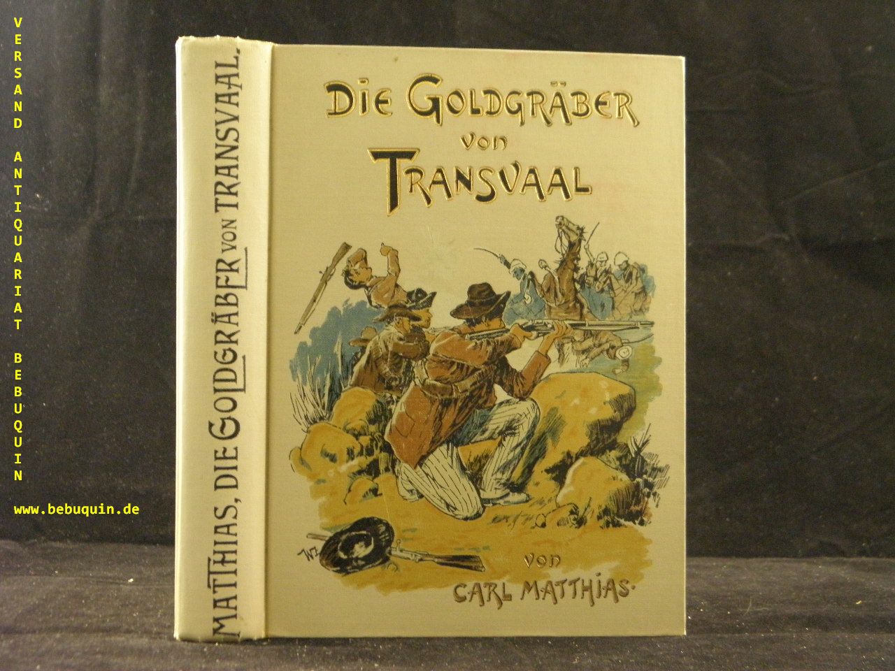 KOLONIEN.– MATTHIAS, Carl: Die Goldgräber von Transvaal. Eine Erzählung für die reifere Jugend. 4. Aufl. Stuttgart (Levy & Müller), ca 1910. Gr. 8°. 290 (2) S. mit 4 Autotypien nach Originalen von Walther Zweigle. farb. ill. OLn. WaT, feines Ex. Klotz 4477/5.