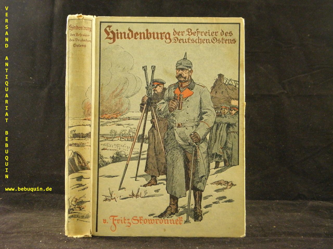 SKOWRONNEK, Fritz: Hindenburg der Befreier des Deutschen Ostens-. Nach amtlichen Quellen, persönlichen Erlebnissen und eigenen Eindrücken geschildert. Berlin (Meidinger), (1915). Gr. 8°. 231 S. mit 5 Farbendruckbildern von Max Wulff. farb. ill. OPb. WaV, Vorsatz gebräunt. EA Klotz 6863/2.
