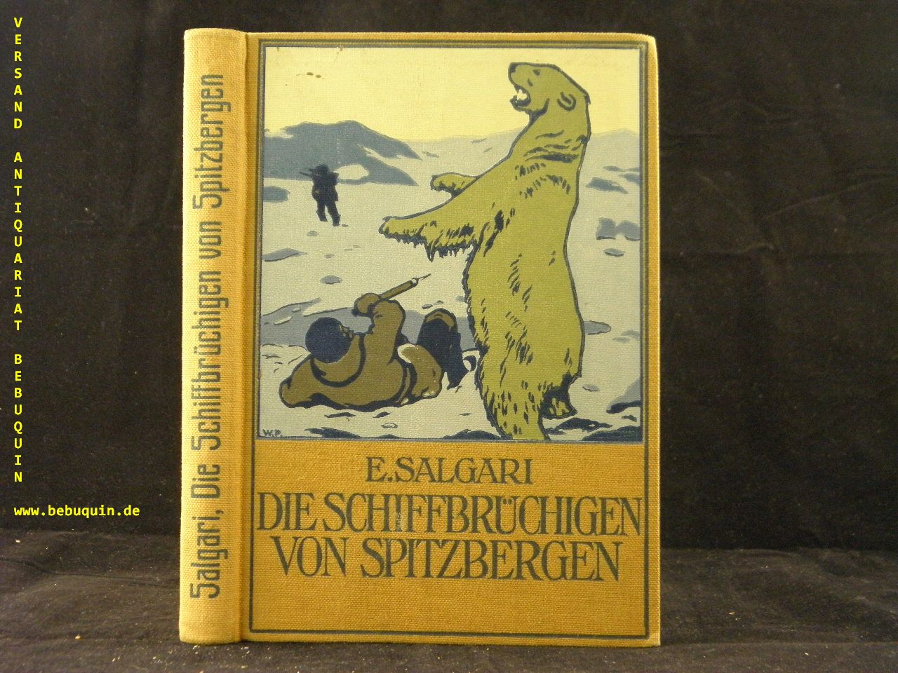 POLARGEBIETE.– SALGARI, E.: Die Schiffbrüchigen von Spitzbergen. D.v. Arthus Wihlfahrt. Stuttgart (Weise), (1913). Gr. 8°. III, 144 S. mit 7 Tondruckbildern. farb. ill. OLn. gutes Ex. dt. EA. Klotz 6118/42.