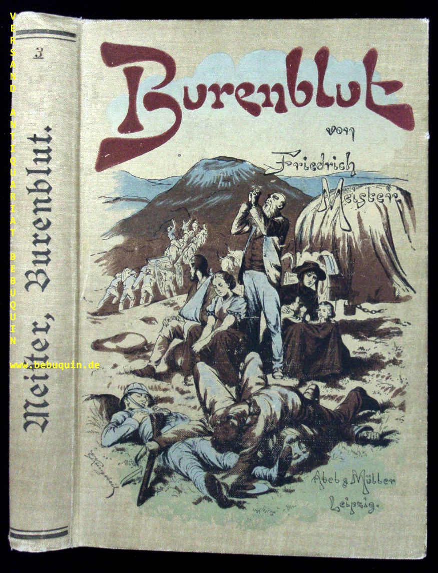 MEISTER, Friedrich: Burenblut. Bilder aus dem letzten Transvaalkriege. 4. Aufl. Leipzig (Abel & Müller), 1903. 251 S. mit 4 Tonbildern + 20 Textbildern von E. Klingebeil. NaV, gutes Ex. Klotz 4551/1; Wegehaupt 2177.