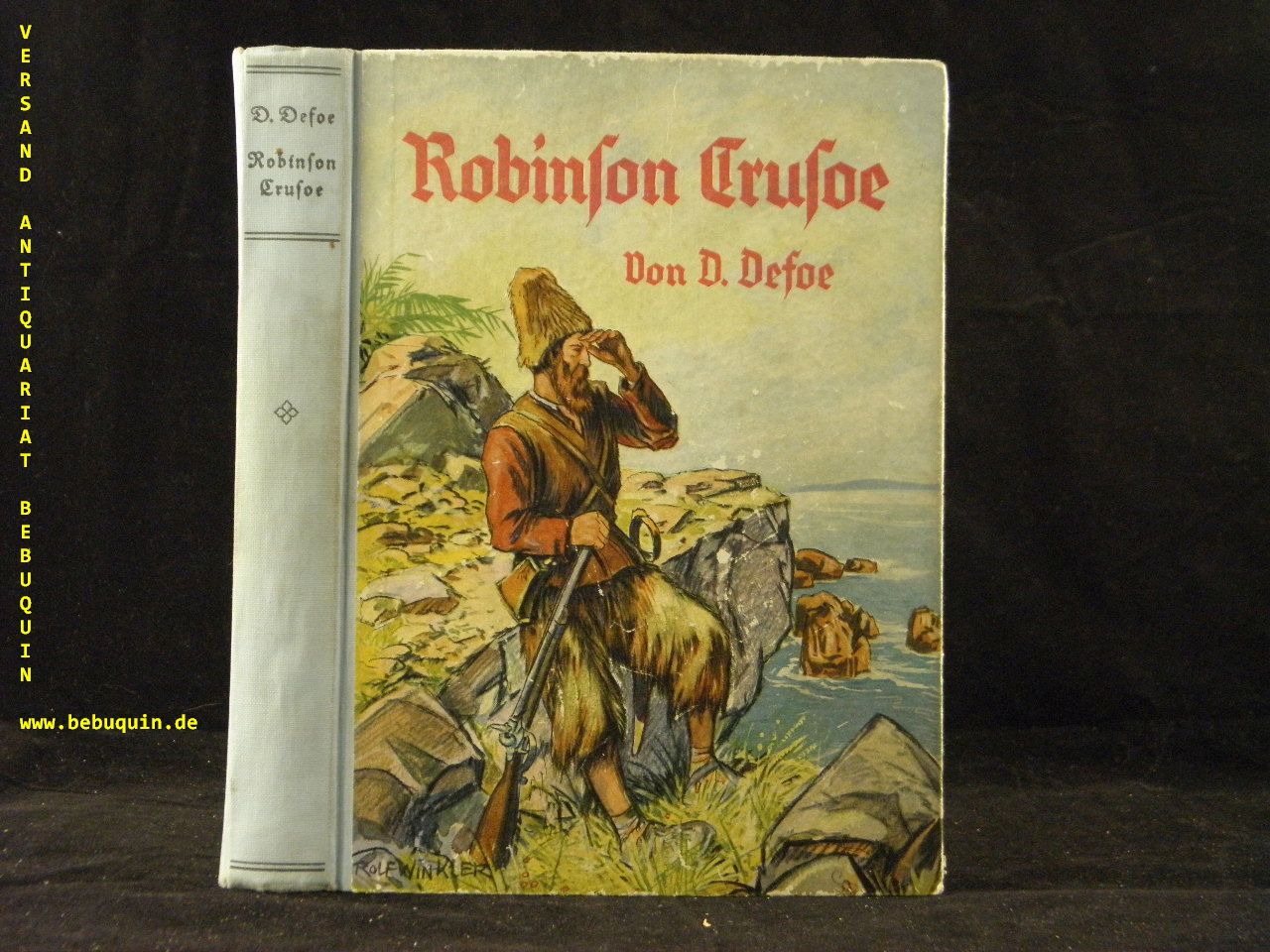 DEFOE, Daniel: Robinson Crusoe. Für die Jugend hrsg. von Robert Münchgesang. Reutlingen (Enßlin & Laiblin), ca 1930. Gr. 8°. 223 S. mit 4 farb. Bildtafeln und zahlr. Textabb. von F. Müller-Münster. frab. ill. OHLn. kaum berieben, insgesamt gut erhalten. 1. Aufl. dieser Ausgabe.