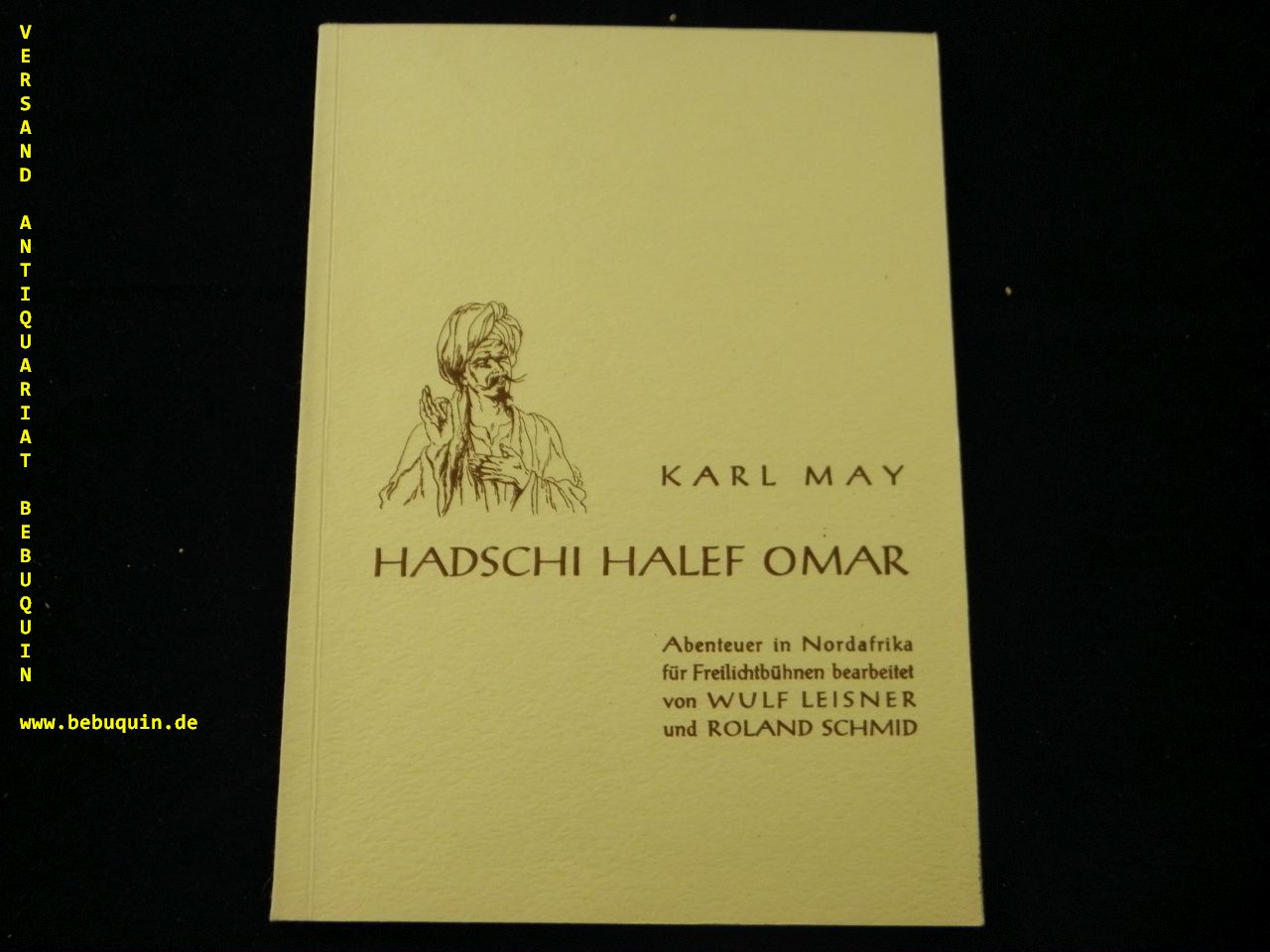 MAY.– LEISNER, Wulf + SCHMID, Roland: (Bearb.) Hadschi Halef Omar. Abenteuer in Nordafrika. Nach Karl Mays Reiseerzählungen Durch die Wüste / Merhameh / Alla il Allah für Freilichtbühnen. 3. Aufl Bamberg (Karl May), 1964. 4, 32 Bl. ill. OKart. tadellos. 1. Aufl. dieser Ausgabe.