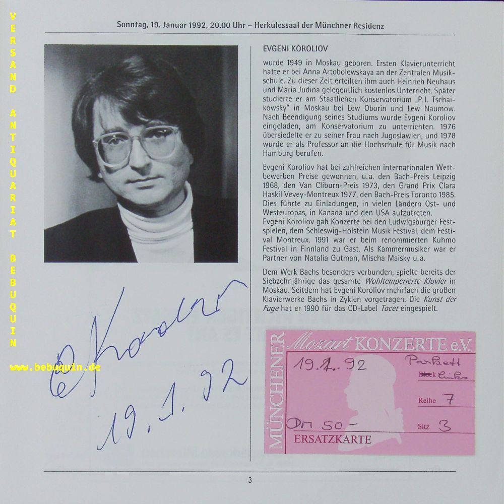 KOROLIOV, Evgeni: Original Programmheft mit der eigenhändigen datierten Signatur des Pianisten an seinem Foto. München (Herkulessaal), 19.1.1992. Gr. 8°. 10 S. mit zahlr. Bildern und 2 Eintrittskarten inliegend. OKart. tadellos. = Müchener Bach Konzerte. Jewgeni Alexandrowitsch Koroljow (* 1. Oktober 1949 in Moskau) ist ein russischer Pianist.