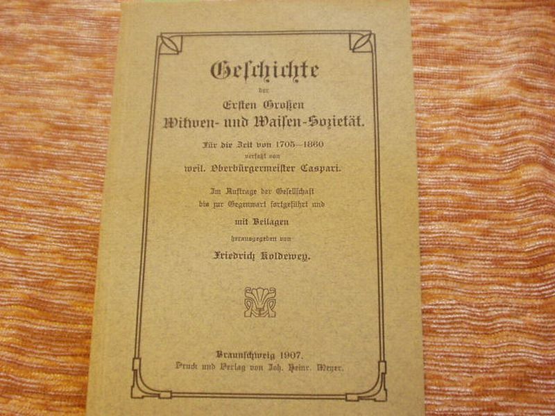 BRAUNSCHWEIG.– CASPARI: Geschichte der Ersten Großen Witwen- und Waisen-Sozietät. Für die Zeit von 1705 – 1860. Hrsg. von Friedrich Koldewey. Braunschweig (Meyer), 1907. 198 S. OKart. EA.