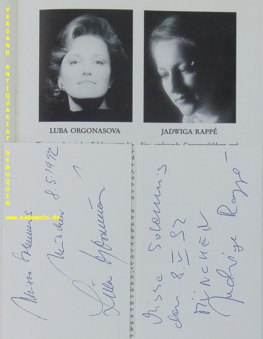 ORGONASOVA, Luba (Sopran) + DAVIS, Colin (Dirigent) + RAPPE, Jadwiga (Alt) + HEILMANN, Uwe (Tenor) + ROOTERING, Jan-Hendrik (Bass): 5 eigenhändig datierte und signierte Autogrammkarten. Mit dem Symphonieorchester des BR. München (Herkulessaal), 8.5.1992. 8 x12,5 cm. 5 Karteikarten in Programmheft (darin eine weitere Signatur von Colin Davis). 16 S. mit zahl. Abb. OKart. inliegend 2 Eintrittskarten. Programm etwas gelockert.