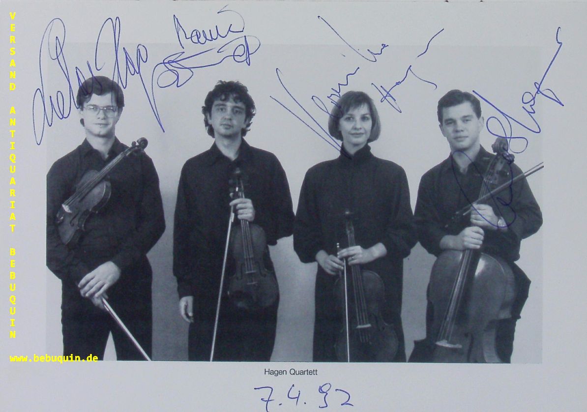 HAGEN QUARTETT.– HAGEN, Lukas + Veronika + Clemens + SCHMIDT, Rainer: Programmheft unter dem Foto von allen eigenhändig signiert und datiert. München (Philharmonie), 7.4.1992. 12 S. mit zahl. Abb. OKart. tadellos = Münchner Konzertdirektion Hörtnagel. Das Hagen Quartett ist ein in den 1970er Jahren gegründetes Streichquartettensemble aus Salzburg und gehört zu den führenden Streichquartetten der Welt. Es bestand ursprünglich aus vier Geschwistern, von denen drei nach wie vor in dem Quartett musizieren. Bekannt wurde das Hagen-Quartett besonders durch seine Gesamteinspielung der Streichquartette Mozarts. (Wikipedia)