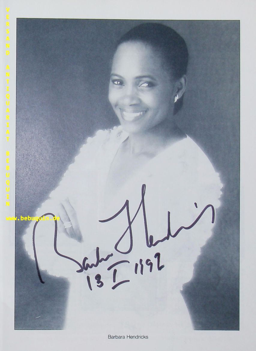 HENDRICKS, Barbara (Sopran): Programmheft mit eigenhändiger Signatur unter dem Portraitfoto. München (Herkulessaal), 13.1.1995. 16 S. mit zahl. Abb. OKart. tadellos = Münchner Konzertdirektion Hörtnagel. Barbara Hendricks (* 20. November 1948 in Stephens, Ouachita County, Arkansas) ist eine amerikanisch-schwedische Sopranistin. (Wikipedia)