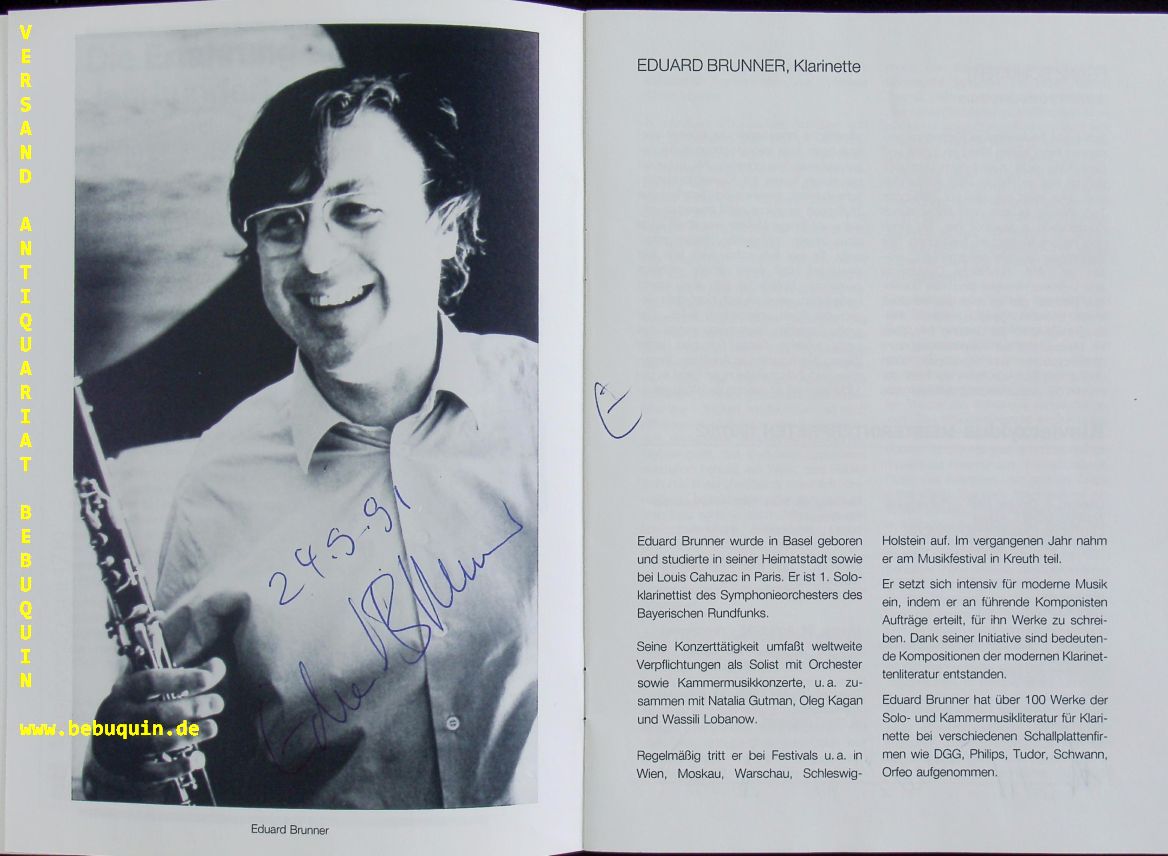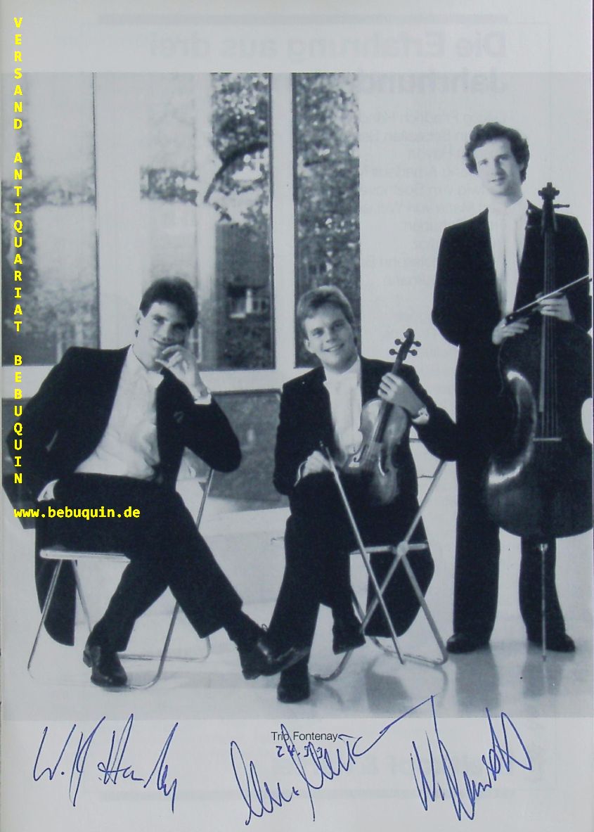 BRUNNER, Eduard (Klarinettist) + TRIO FONTENAY: Trio Fonternay sind Wolf Harden, Michael Mücke und Niklas Schmidt. 2 Programmhefte mit eigenhändiger Signatur von allen an den Portraitfotos. München (Philharmonie), 24.9.1991. 16 S. mit zahl. Abb. OKart. tadellos = Münchner Konzertdirektion Hörtnagel.