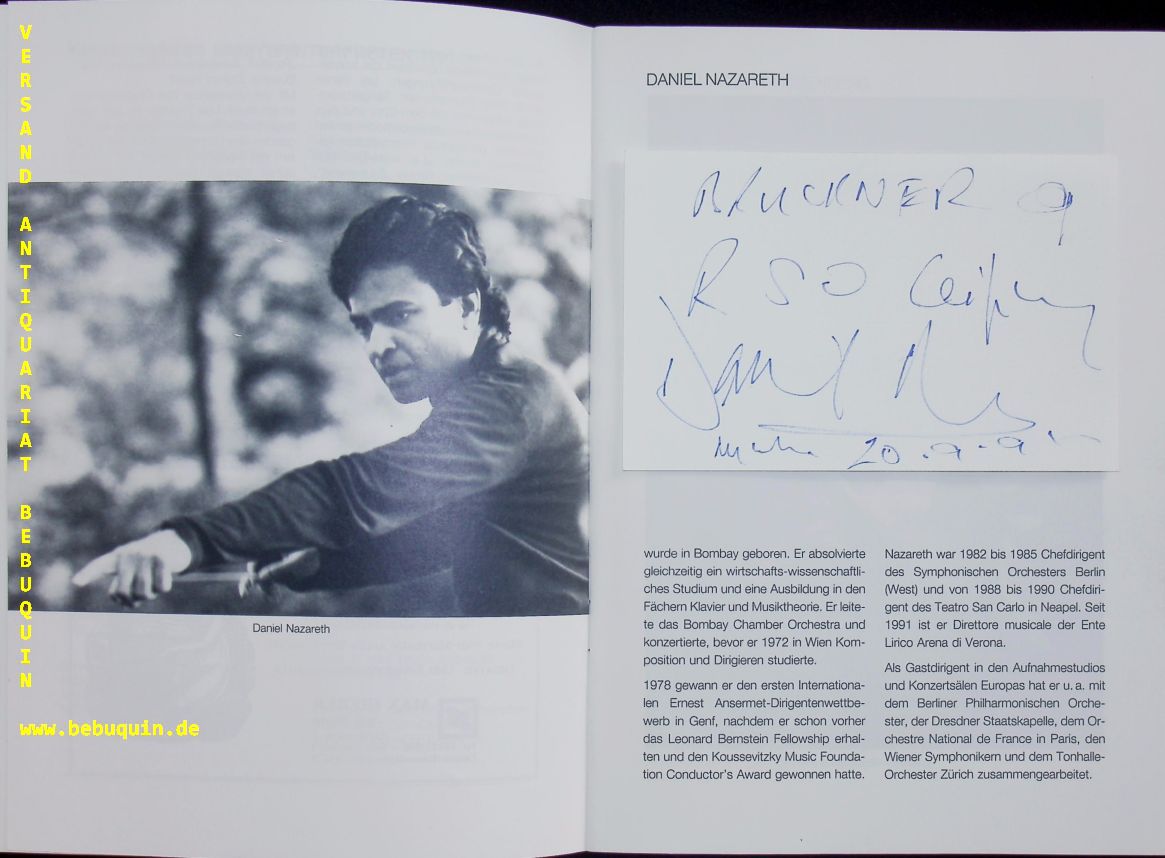 HUNDA-ROSENBERG, Latica (Violinistin) + NAZARETH, Daniel (Dirigent): 2 eigenhändig signierte und datierte Autogrammkarte. Mit dem Rundfunk-Sinfonieorchester Leipzig. München (Philharmonie), 20.9.1991. 8 x 12,5 cm. 2 Karteikarten in Programmheft. 16 S. mit Abb. OKart. tadellos = Münchner Konzertdirektion Hörtnagel. Daniel Nazareth (* 8. Juni 1948 in Bombay; † 19. Juni 2014 in Wien) war ein österreichischer Dirigent und Komponist indischer Herkunft. Von 1992 bis 1996 war er Chefdirigent des MDR Sinfonieorchesters in Leipzig. (Wikipedia)