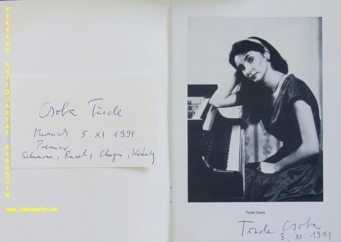 CSOBA, Tünde (Pianistin): Programmheft mit der eigenhändigen Signaturen am Portraitfoto. München (Herkulessaal), 5.11.1991. 16 S. mit Abb. OKart. dabei eine eigenhändig signierte und datierte Karteikarte sowie Eintrittskarte. tadellos = Münchner Konzertdirektion Hörtnagel. Ungarische Pianistin, die gefördert von Annie Fischer und Georg Solti in den großen Städten Europas konzertierte. Später hörte man nichts mehr von ihr. Seltene Autogramme.