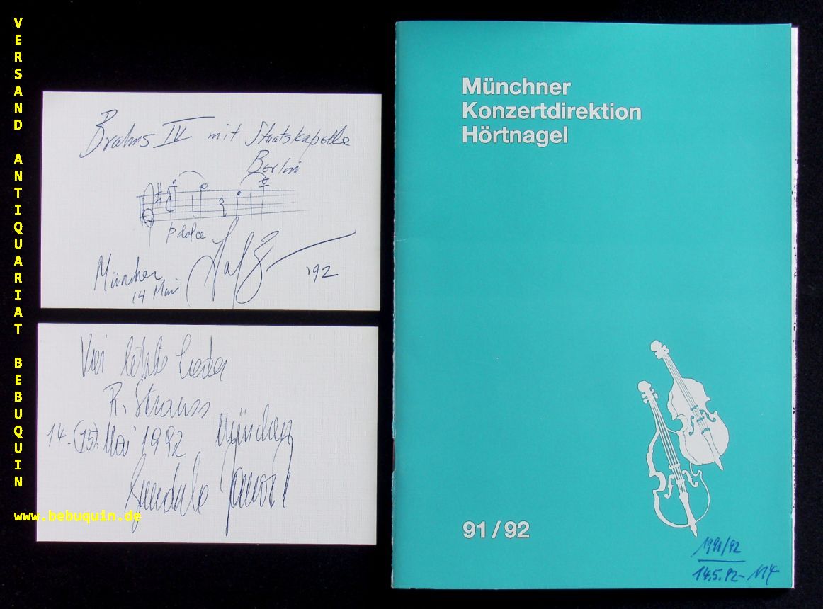 ZINMAN, David (Dirigent) + JANOWITZ, Gundula (Sopran): 2 eigenhändig datierte und signierte und von David Zinman mit einem Notenzitat versehene Autogrammkarten. München (Herkulessaal), 14..5.1992. 2 Karteikarten in Programmheft. 16 S. mit zahlr. Abb. OKart. gutes Ex. David Joel Zinman (* 10. Juli 1936 in New York) ist ein US-amerikanischer Dirigent. Gundula Janowitz ersetzt Sharon Sweet, die wegen einer Erkältung absagen musste.