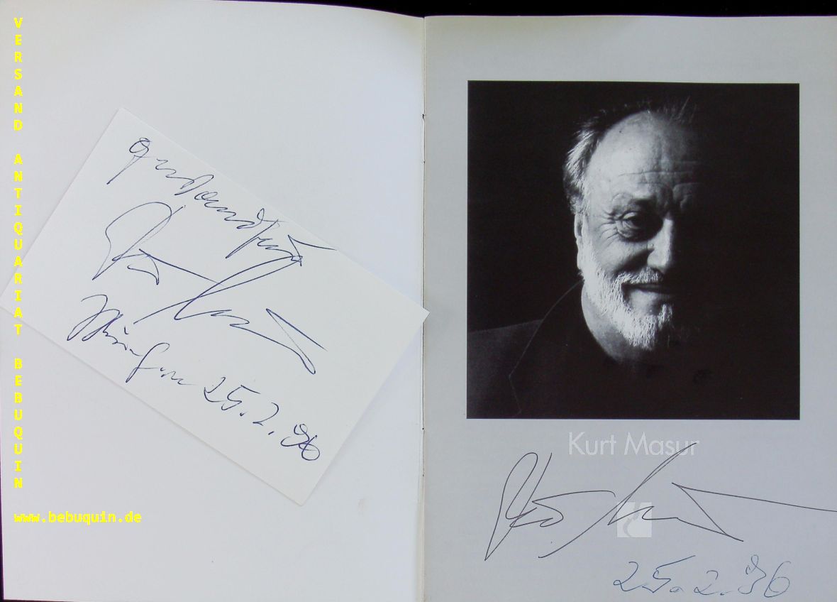 MASUR, Kurt (Dirigent): eigenhändig signierte und datierte Autogrammkarte. München (Herkulessaal), 25.2.1996. 8 x 12,5 cm. Karteikarten in Programmheft. Dieses am Titelportrait ebenfalls eigenhändig datiert und signiert. Eintrittskarte liegt bei. 16 S. mit Abb. OKart. tadellos = Münchner Konzertdirektion Hörtnagel. Kurt Masur (* 18. Juli 1927 in Brieg, Niederschlesien; † 19. Dezember 2015 in Greenwich, Connecticut) war ein deutscher Dirigent. Er war von 1970 bis 1996 Gewandhauskapellmeister in Leipzig, von 1991 bis 2002 Musikdirektor der New Yorker Philharmoniker und von 2000 bis 2007 Chefdirigent des London Philharmonic Orchestra. (Wikipedia)