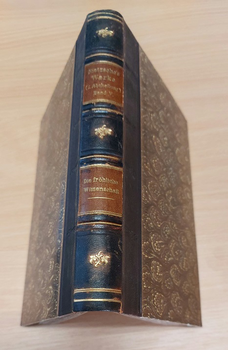 NIETZSCHE, Friedrich: Die fröhliche Wissenschaft. (“ la gaya scienza“) 20. Tsd. Leipzig (Naumann), 1908. Gr. 8°. 362, XIII S. mit 1 Faks. OHLdr mit zwei rotbraunen Rückenschildern und goldgeprägtem Rücken. schönes Ex. der gesuchten Halblederausgabe in der Sonderausstattung. = Werke, 1. Abt. Bd. V. 1 von 1000 Ex. dieser letzten Ausgabe im Naumann Verlag. nicht bei Knoche.