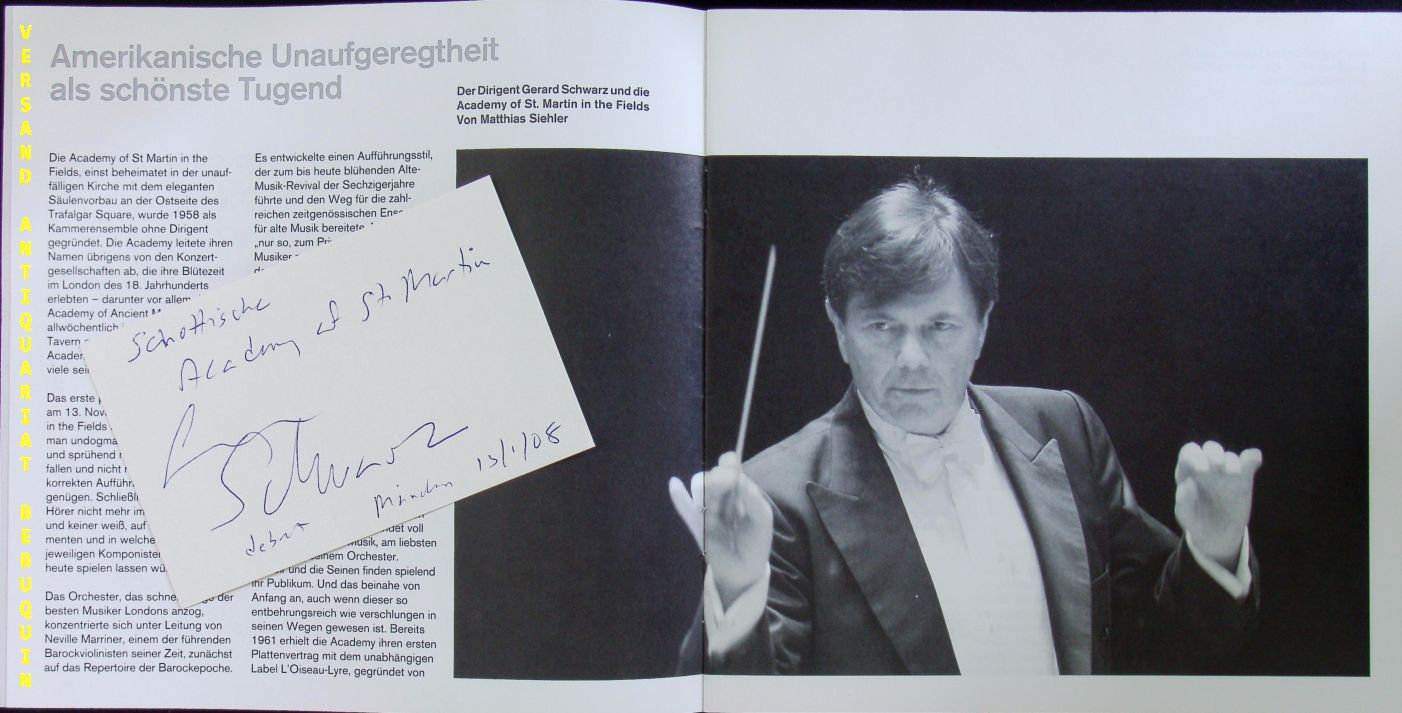 SCHWARZ, Gerard (Dirigent): eigenhändig signierte und datierte Autogrammkarte. Mit der Academy of St. Martin in the Fields. München (Philharmonie), 13.1.2008. 8 x 12,5 cm. Karteikarte in Programmheft. 12 S. mit zahlr. Abb. OKart. tadellos = Winderstein Konzerte. Gerard Schwarz (* 19. August 1947 in Weehawken, New Jersey), Sohn in die Vereinigten Staaten ausgewanderter österreichisch-jüdischer Eltern, ist ein US-amerikanischer Dirigent und Trompeter. (Wikipedia)