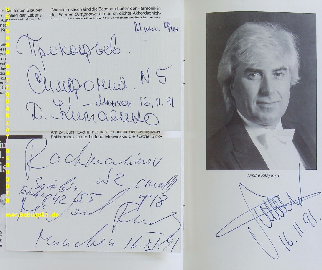 KITAJENKO, Dmitrij (Dirigent) + RUDY, Mikhail (Pianist): 2 eigenhändig signierte und datierte Autogrammkarten. München (Philharmonie), 13.11.1991. 8 x 12,5 cm. 2 Karteikarten in Programmheft. Dort auch zusätlich eigenhändig neben dem Portraitbild von Dmitrij Kitajenko signiert und datiert. 12 S. mit zahlr. Abb. OKart. anbei 2 Eintrittskarten tadellos = Münchner Philharmonie