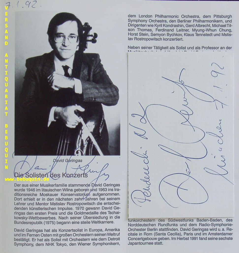 PENDERECKI, Krzystof (Dirigent) + GERINGAS, David (Cembalo): 2 eigenhändig signierte und datierte Autogrammkarten. München (Philharmonie), 5.1.1992. 8 x 12,5 cm. 2 Karteikarten in Programmheft. Darin zusätzlich von beiden Musikern an ihrem Bild mit schönen datierten Signaturen versehen. 12 S. mit zahlr. Abb. OKart. anbei 2 Eintrittskarten tadellos = Münchner Philharmonie Krzysztof Eugeniusz Penderecki (* 23. November 1933 in Debica; † 29. März 2020 in Krakau) war ein zeitgenössischer polnischer Komponist, dessen Werk der postseriellen Musik zugeordnet wird und der vor allem durch seine Klangkompositionen Aufsehen erregte. Für diese speziell in der Instrumentalmusik angewandte Technik wurde von Seiten der polnischen Musikwissenschaft, namentlich von Zofia Lissa und Józef Michal Chominski, der Begriff Sonorismus entwickelt. Er gilt als einer der führenden Komponisten der polnischen Avantgarde, der mit seiner Musik „den Kompositionsstil einer ganzen Ära der zeitgenössischen Musik mitgeprägt“ hat. Sein unerschrockenes Eintreten für christliches Gedankengut und Menschlichkeit sowie seine unverwechselbare Tonsprache ließen Penderecki zur Galionsfigur einer „polnischen Schule“ der Avantgarde werden. David Geringas (* 29. Juli 1946 in Vilnius) ist ein in Deutschland lebender litauischer Cellist und Dirigent. (Wikipedia)