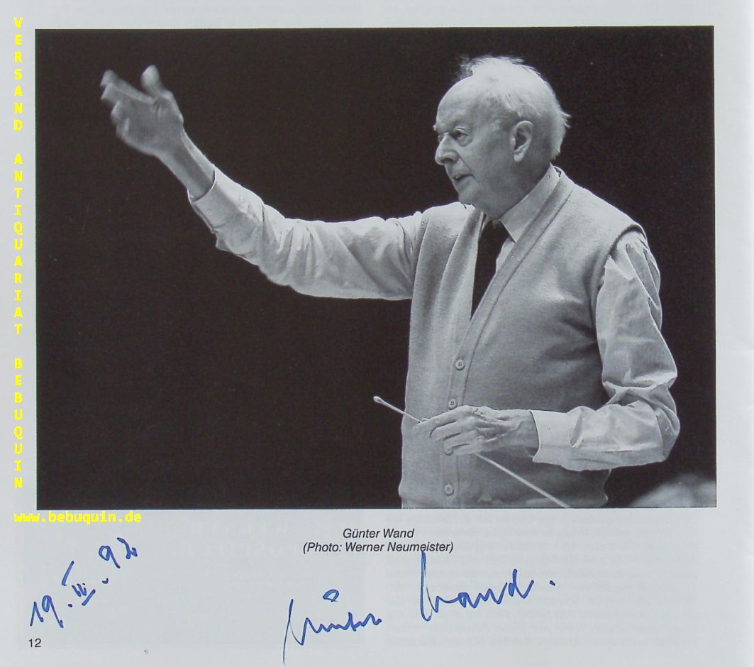 WAND, Günter (Dirigent): Programmheft mit eigenhändig signiertem und datiertem Foto von Werner Neumeister. München (Philharmonie), 18.2.1992. 20 x 20 cm. 12 S. mit zahlr. Abb. OKart. mit 1 Eintrittskarte beiliegend. tadellos = Münchner Philharmonie Günter Wand (* 7. Januar 1912 in Elberfeld, heute Stadtteil von Wuppertal; † 14. Februar 2002 in der Gemeinde Ulmiz, Kanton Freiburg Schweiz) war ein deutscher Dirigent. (Wikipedia)