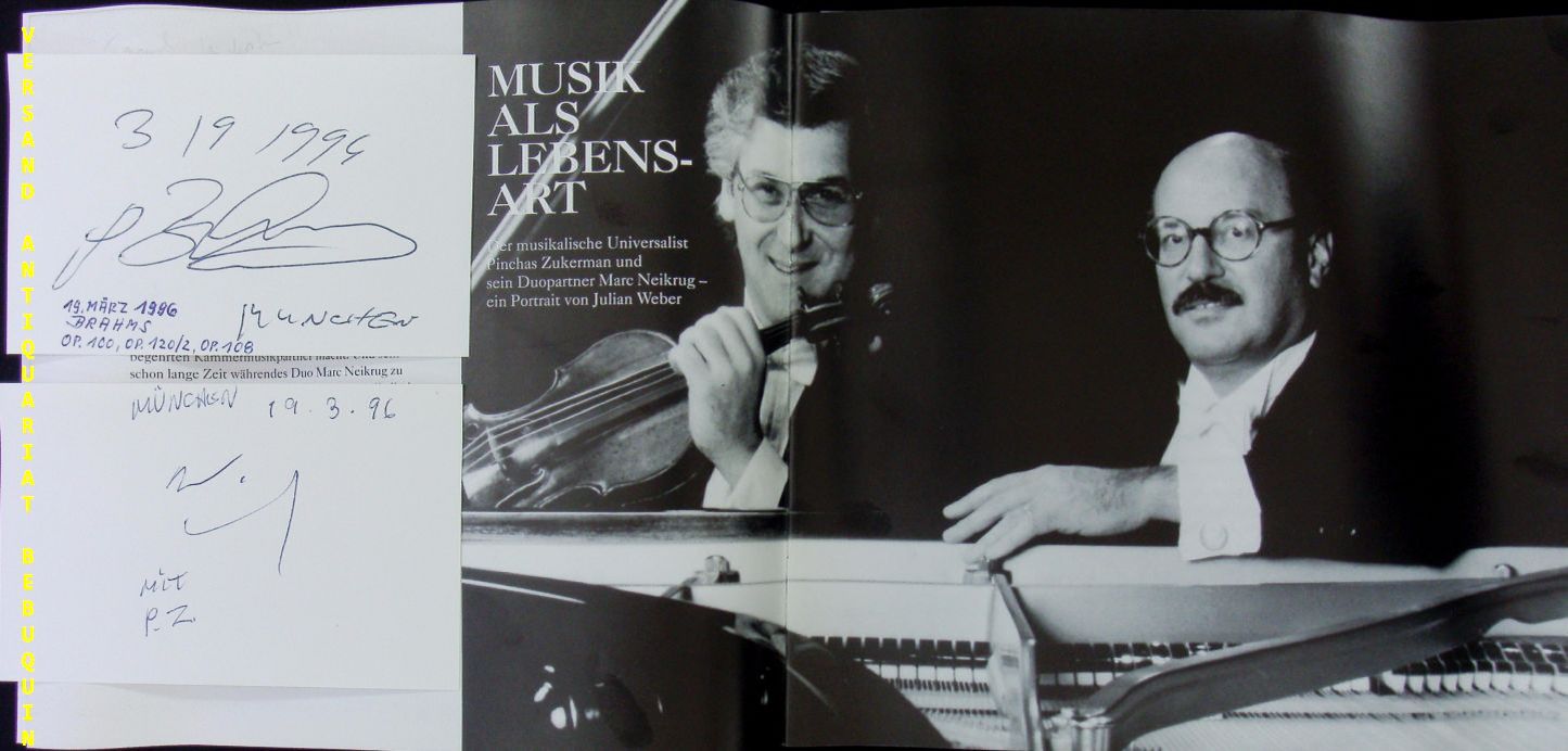 ZUKERMAN, Pinchas (Violinist) + NEIKRUG, Marc (Pianist): 2 eigenhändig signierte und datierte Autogrammkarte. München (Philharmonie), 19.3.1996. 8 x 12,5 cm. 2 Karteikarte in Programmheft. 12 S. mit zahlr. Abb. OKart. leicht gewellt. = Winderstein Konzerte. Pinchas Zukerman (* 16. Juli 1948 in Tel Aviv) ist ein israelischer Violinist, Bratschist und Dirigent. Marc Neikrug (* 24. September 1946 in New York City) ist ein US-amerikanischer Komponist und Pianist. Ab Mitte der 1970er Jahre trat Neikrug als Duopartner von Pinchas Zukerman auf. Seit 1998 ist er künstlerischer Leiter des Santa Fe Chamber Music Festival. Seine Laufbahn als Komponist begann 1966 mit einem Klavierkonzert. Bekannt wurde er durch sein Musiktheaterstück Through Roses (1980). Das Auftragswerk der New Yorker 92nd Street Y erzählt die Geschichte eines Geigers, der Auschwitz überlebte. Es wurde in elf Sprachen übersetzt und erlebte über 500 Aufführungen in fünfzehn Ländern. (Wikipedia)
