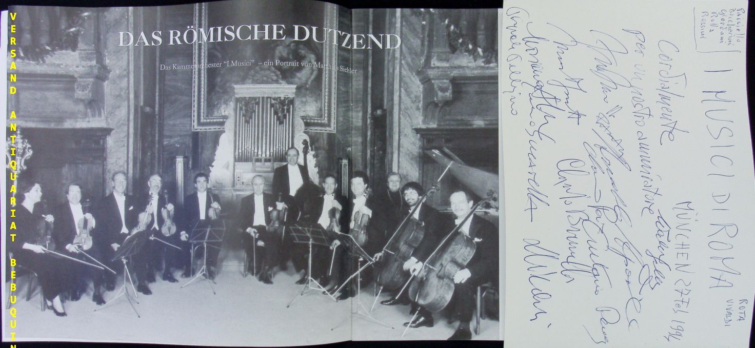 I MUSICI DI ROMA: 11 eigenhändige Signaturen der Mitglieder auf großer Autogrammkarte. München (Philharmonie), 27.2.1994. 14,5 x 21 cm. 12 S. mit zahlr. Abb. OKart. mit 1 Eintritskarte. leicht gewellt. = Winderstein Konzerte. Das Ensemble I Musici wurde 1951 in Rom von Studenten der Accademia Nazionale di Santa Cecilia unter Leitung ihres Professors Remy Principe gegründet. Es besteht aus 11 Streichern (6 Violinen, 2 Violen, 2 Celli, Kontrabass) und einem Cembalisten und spielt ohne Dirigenten. Eine gewisse Leitungsfunktion hat der jeweilige erste Violinist inne (1958–67 Félix Ayo, 1967–72 Roberto Michelucci, 1972–77 Salvatore Accardo, 1977–86 Pina Carmirelli, 1986–92 Federico Agostini, 1992–2003 Mariana Sîrbu, 2003–10 Antonio Salvatore, 2010–2019 Antonio Anselmi,[1] seit 2019 Marco Fiorini).