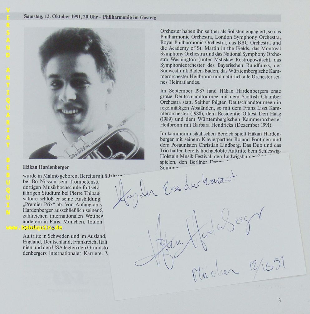 HARDENBERGER, Hakan (Trompeter) + JÄRVI, Neeme (Dirigent): 2 eigenhändig signierte und datierte Autogrammkarten. Mit den Göteburger Symphonikern. München (Philharmonie), 12.10.1991. 8 x 12,5 cm. 2 Karteikarte in Programmheft. 2 Eintrittskarten anbei. 12 S. mit zahlr. Abb. OKart. = Münchener Mozart Konzerte. Håkan Hardenberger (* 1961 in Malmö) ist ein schwedischer Trompeter. Durch sein Spiel inspirierte er auch neben den oben Genannten andere Komponisten wie die Österreicher HK Gruber und Kurt Schwertsik zu neuen Kompositionen, letzteren zu Divertimento macchiato (2007). Hardenberger gilt als der führende Trompeter in der klassischen und Neuen Musik unserer Zeit. Neeme Järvi (* 7. Juni 1937 in Tallinn) ist ein in Estland geborener Dirigent. Er ist seit 1987 US-amerikanischer Staatsbürger. (Wikipedia)