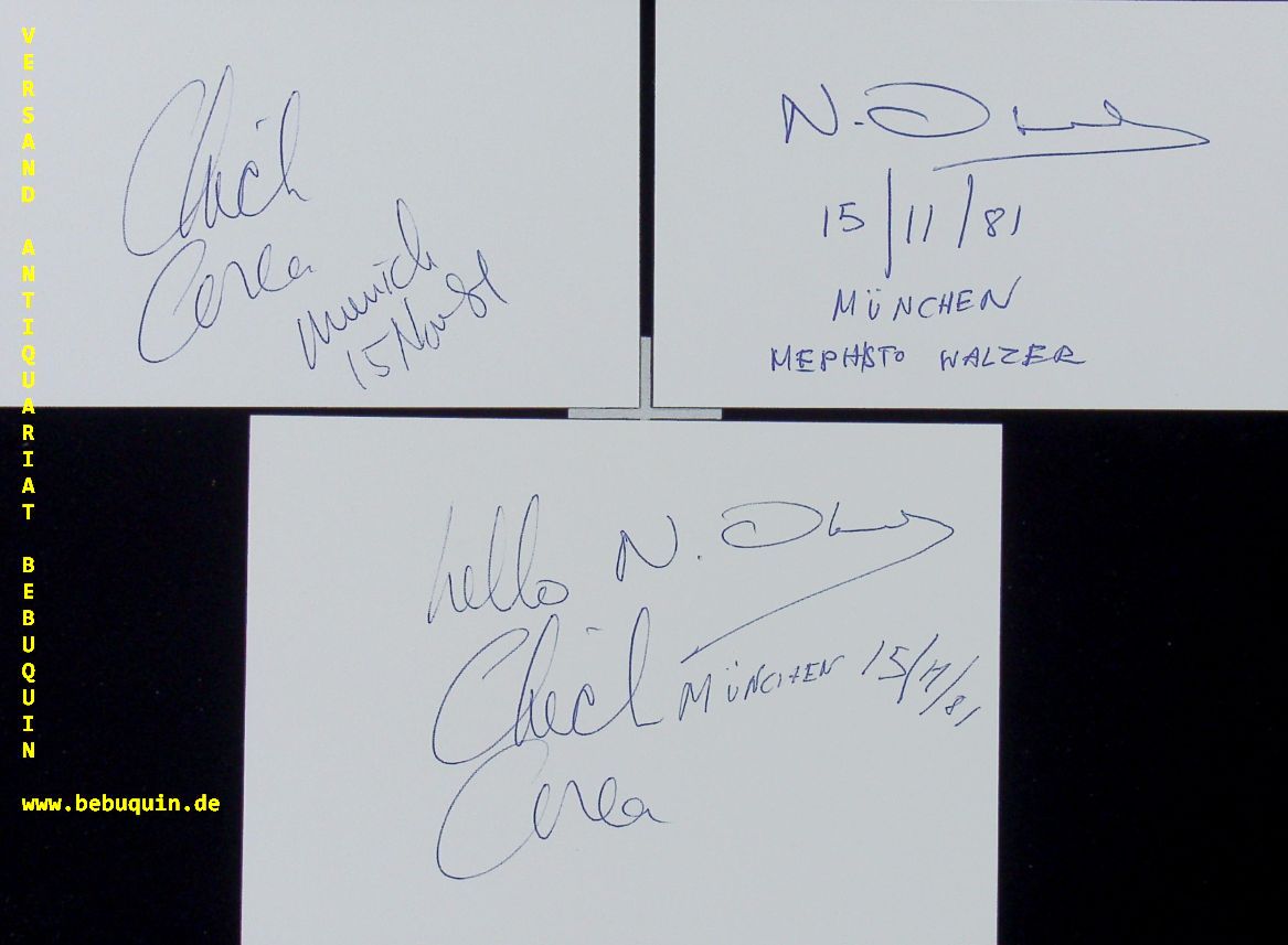 JAZZ.– COREA, Chick + ECONOMOU, Nicolas (Pianisten): 3 eigenhändig signierte und datierte Autogrammkarten. (einzeln und zusammen) München (Deutsches Museum), 15.11.1981. 8 x 12,5 cm + 10,5 x 14,5 cm. 3 Karteikarten mit Programmzettel. ill. OKart.